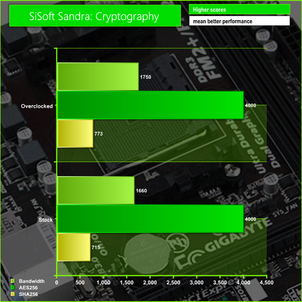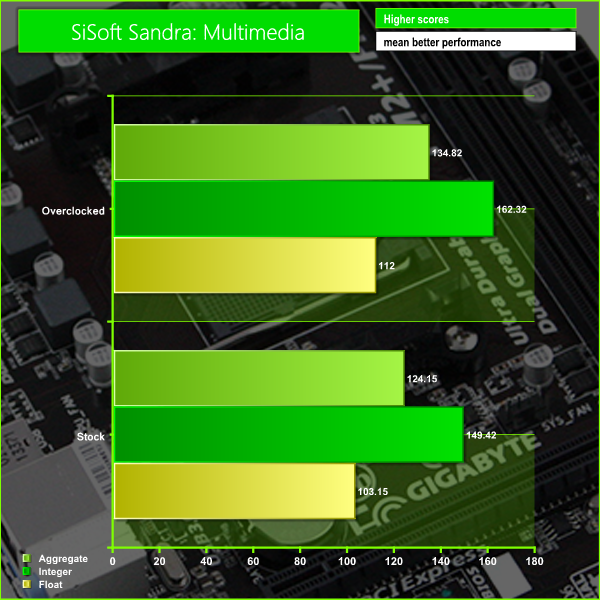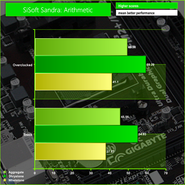 In this test we can see how well the raw CPU performance of the motherboard improved after overclocking the system.