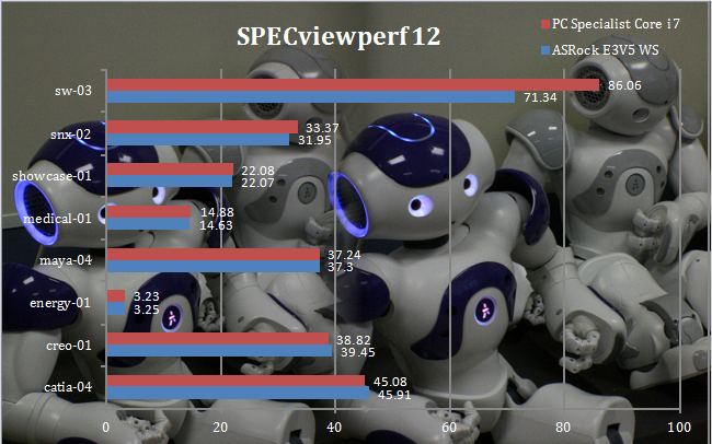 Most of the SPECviewperf 12 tests are not processor-sensitive, so the ASRock E3V5 WS's NVIDIA Quadro K2200 performs almost the same as the one in the PC Specialist comparison system.