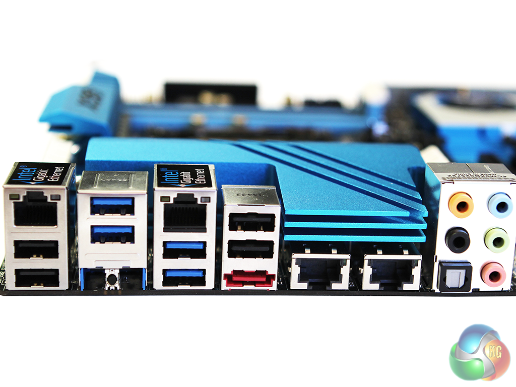 The backplane sports two regular Intel Gigabit Ethernet ports, one with a pair of USB 2 ports underneath, and one with a pair of USB 3 ports. Two more USB 3 ports sit above an external clear CMOS switch, whilst two more USB 2 accompany the eSATA port.