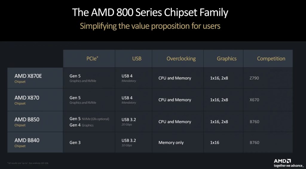Targeted at the mainstream market, the B850 will succeed the B650, allowing CPU and memory overclocking and featuring PCIe 4.0 lanes for graphics (PCIe 5.0 is optional), PCI 5.0 for NVMe storage, and USB 3.2 support (20 Gbps). That puts it on par with the previous X670. As for the B840, it's a new series with restricted PCIe support up to Gen3, USB 3.2 (10 Gbps), and memory overclock capabilities. This will be aimed at the commercial and entry-level sectors, replacing the existing A620.