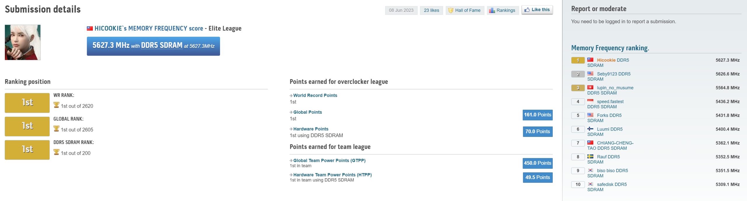 HiCookie set the new record with an impressive 11,255 MHz (timings 64-127-127-127) using Aorus DDR5 memory (16GB) modules and an LN2-cooled Intel Core i9-13900K clocked at 0.8 GHz. In second place, there's Seby9123 with an 11,253MHz memory frequency, followed by lupin_no_musume with 11,128MHz.