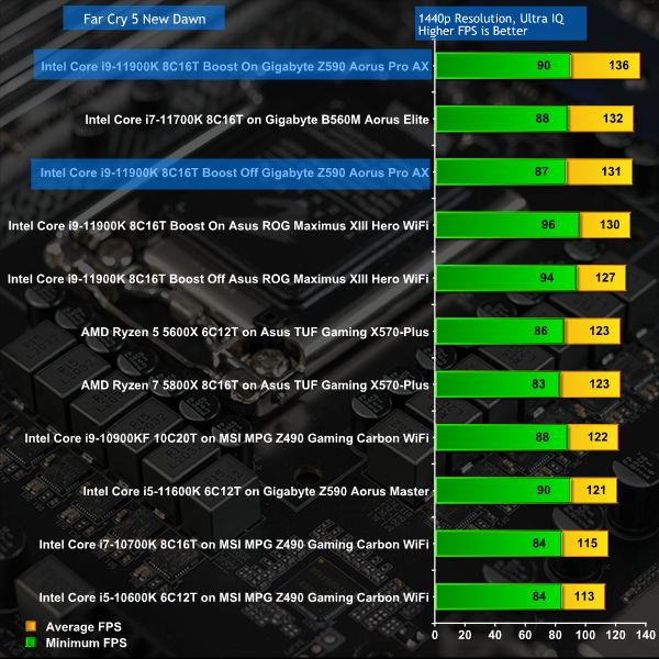 With Far Cry 5 New Dawn we can see the CPUs and motherboards that were tested most recently top the charts and directly behind them you find the Core i9-11900K on the Asus. And then we come to Watch Dogs: Legion which delivers results that are pretty much the opposite of what we see with Far Cry 5 New Dawn.