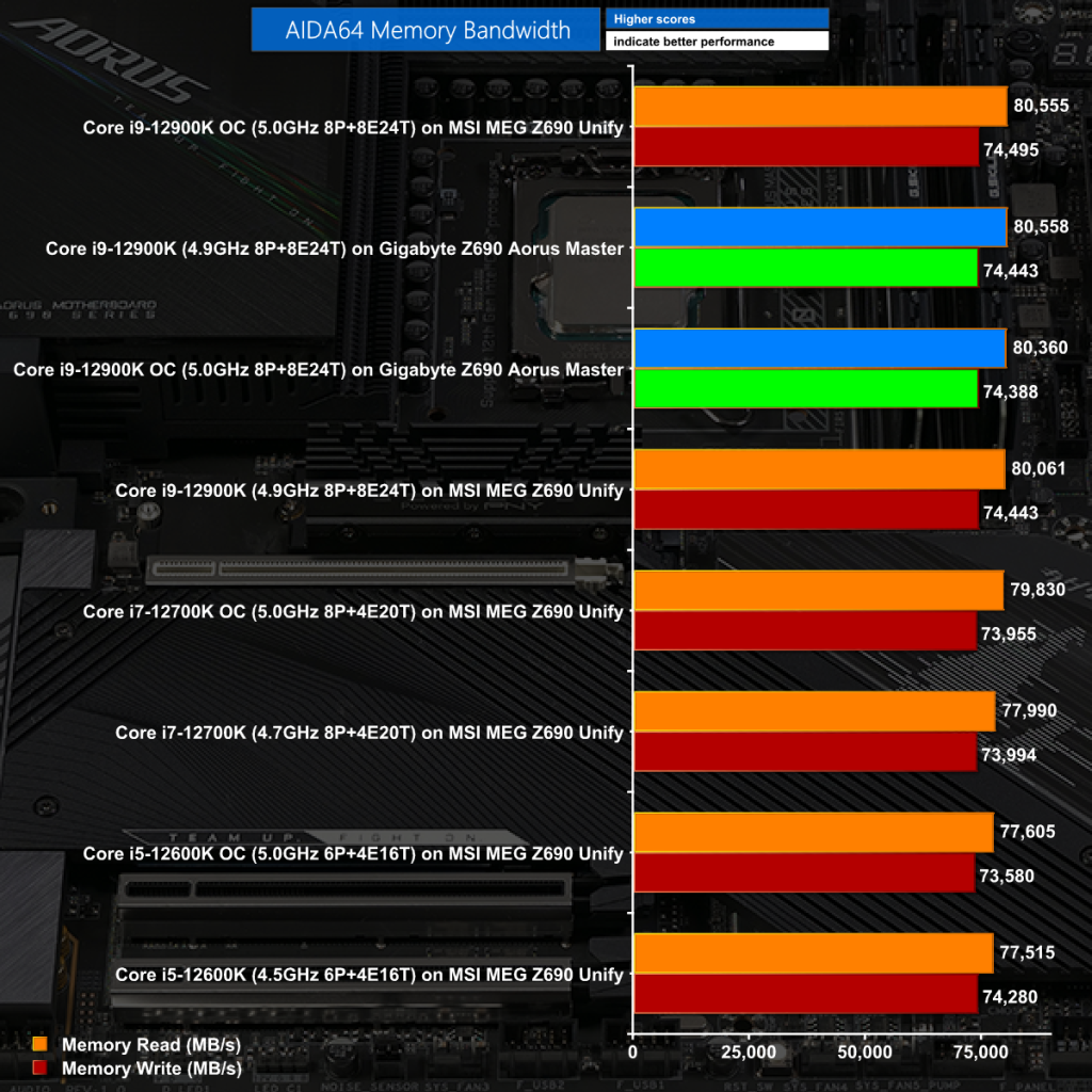 The AIDA64 Memory Bandwidth gives the win to MSI MEG Z690 Unify however the numbers are very close. In essence the Corsair Vengeance DDR5 runs at XMP on both motherboards without any fuss or drama.