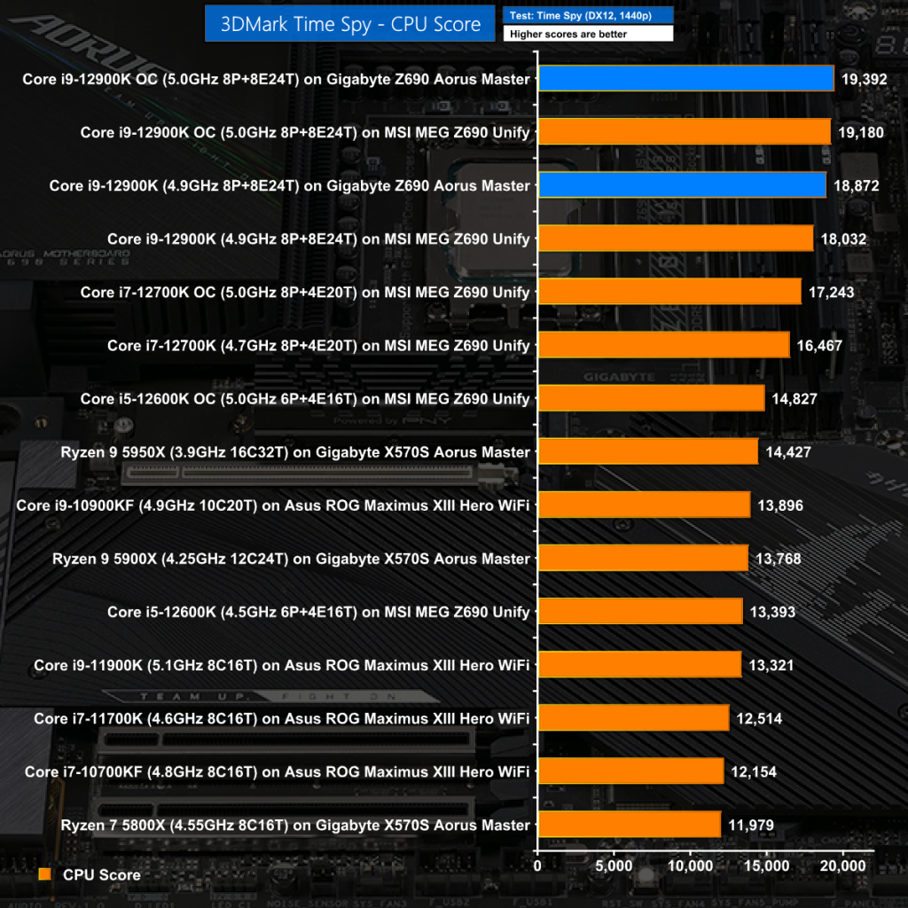 In the CPU test of 3D Mark Time Spy the Gigabyte Z690 Aorus Master wins by a handy margin. When we retest the MSI MEG Z690 Unify in the near future we will be able to determine just how large the gap is.