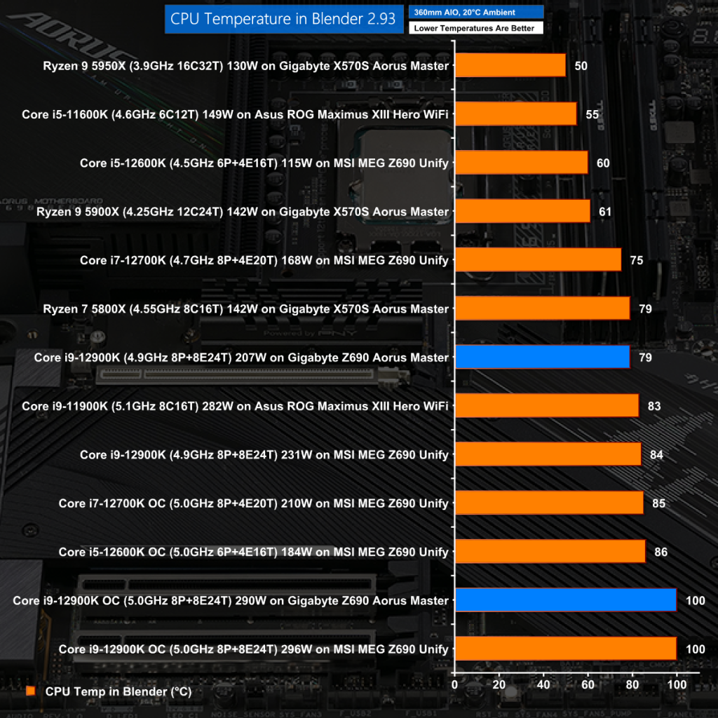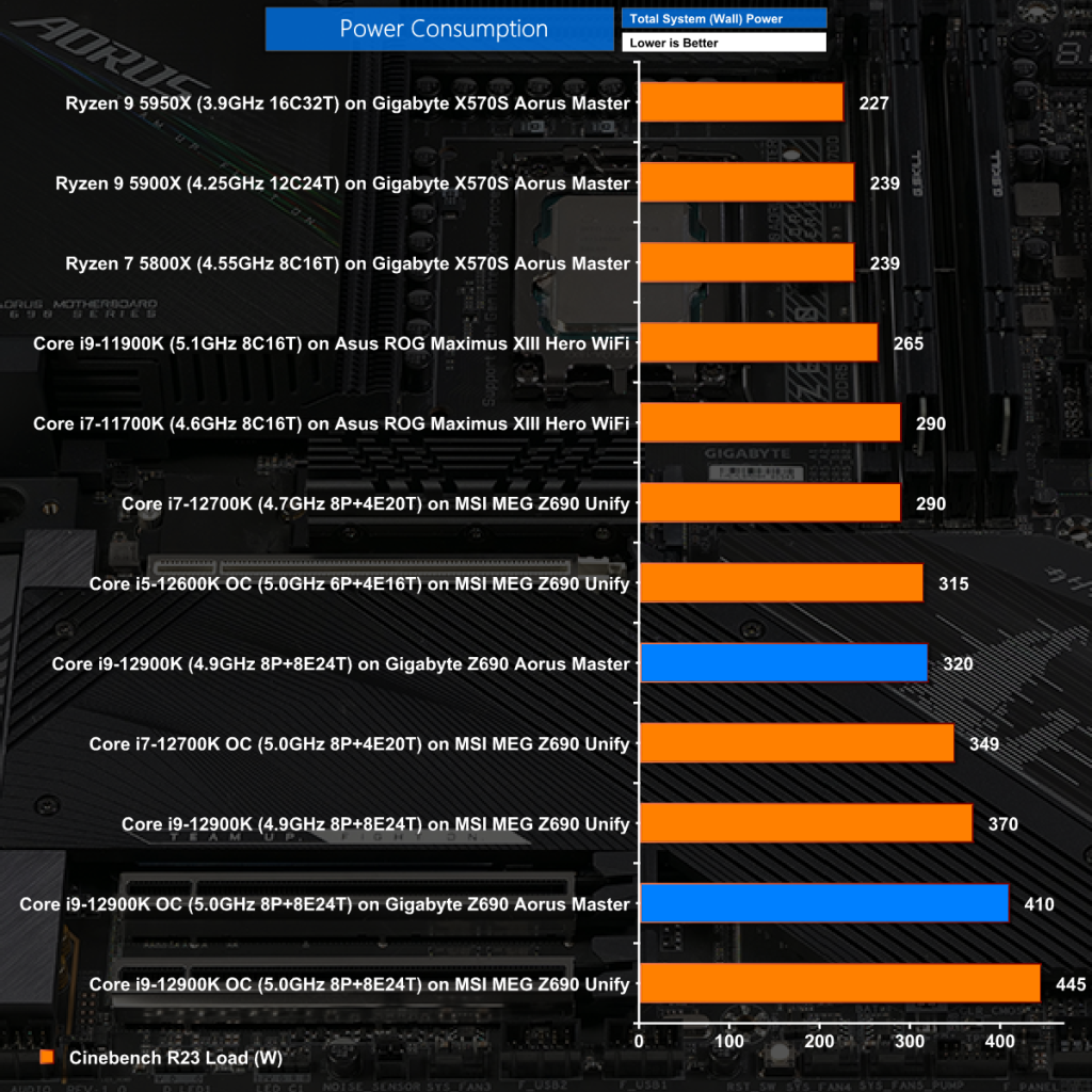 We know that Core i9-12900K requires a significant amount of power but it comes as a real surprise to see the Gigabyte Z690 Aorus Master can power the CPU using 50W less than the MSI MEG Z690 Unify. We cannot wait to retest the MSI motherboard as it currently seems that Gigabyte has done something rather clever with their BIOS and voltage settings.