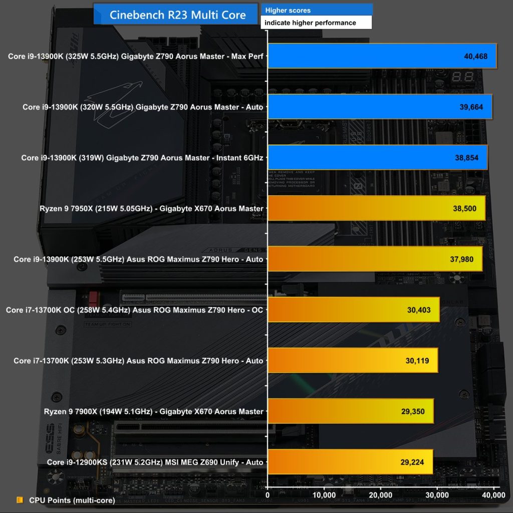 In Cinebench R23 Multi Core the Gigabyte pushes our Core i9-13900K hard, however the Instant 6GHz BIOS profile looks disappointing and delivers lower performance than the default Auto profile.