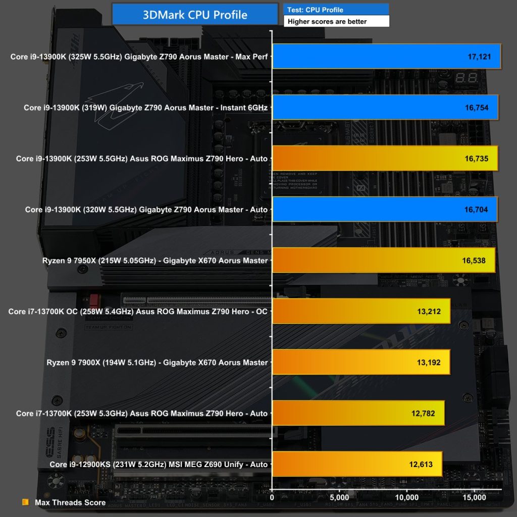 3D Mark CPU Profile shows the Gigabyte Z790 Aorus Master at the top of the chart, two percent ahead of the Asus ROG Maximus Z790 Hero.