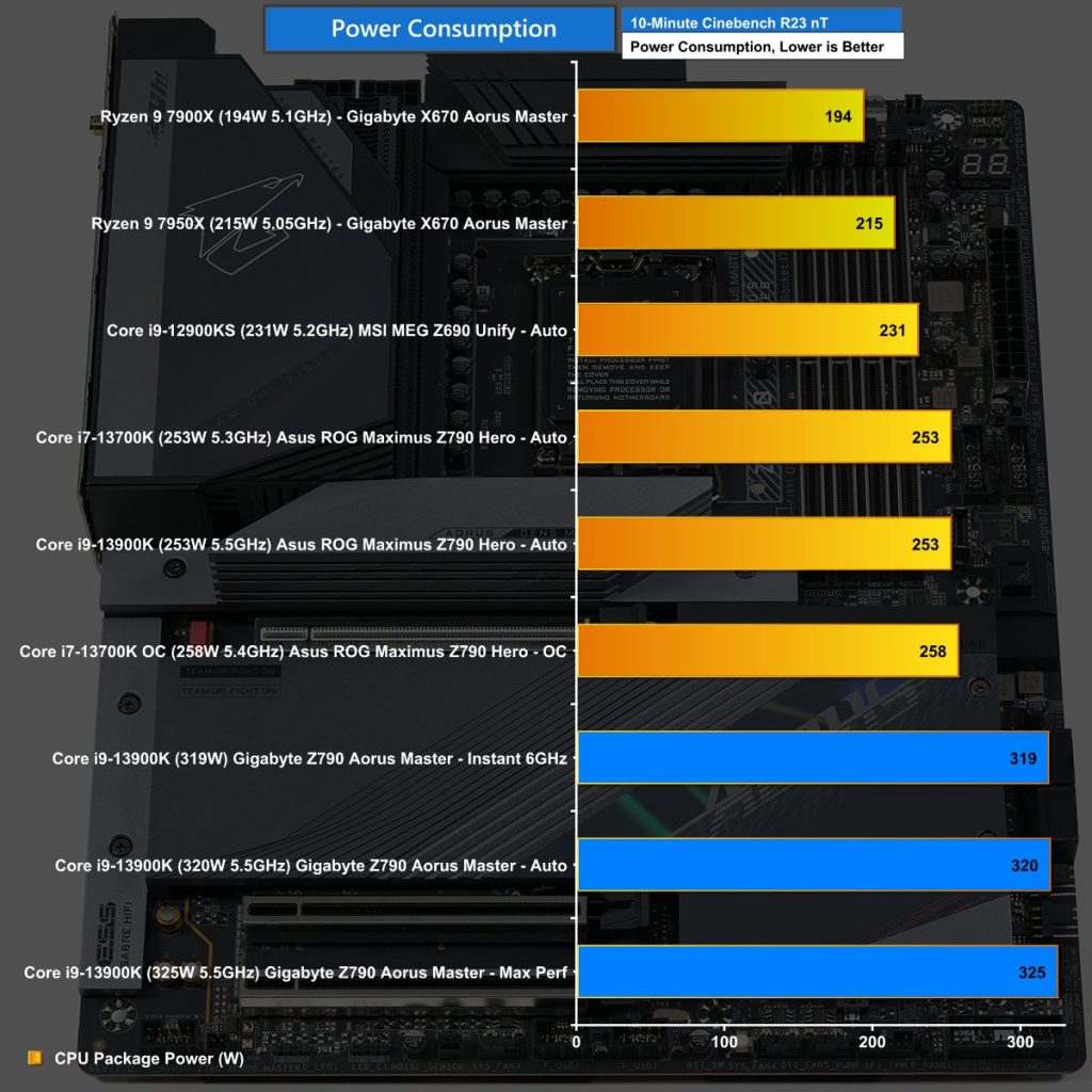 Our Power Consumption figures give the game away about how Gigabyte gets performance from the Core i9-13900K as it rams over 300W through the CPU under load. This is fully 25 percent more power than the Asus ROG Maximus Z790 Hero.