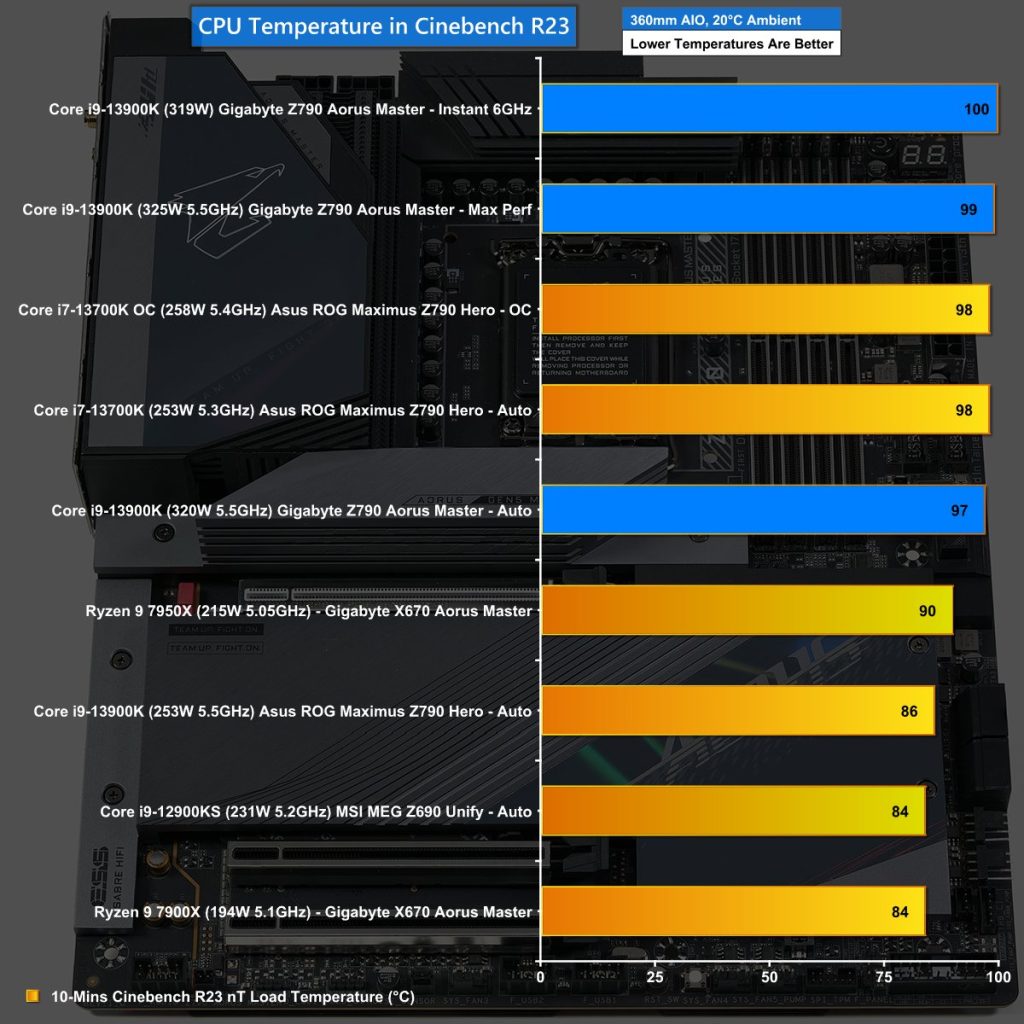 The power loads employed by Gigabyte push the temperature of our Core i9-13900K unecessarily high, despite our running a 360mm AIO cooler during testing. We can see the Instant 6GHz profile pushes the CPU to 100 degrees C at which point it throttles and this explains the unexpected performance figure in Cinebench R23 Multi Core.