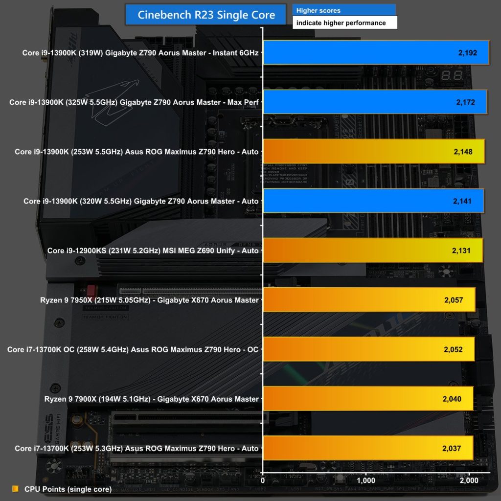 In Cinebench R23 Single Core there is very little in it however the Gigabyte Z790 Aorus Master takes top honours by a narrow margin.