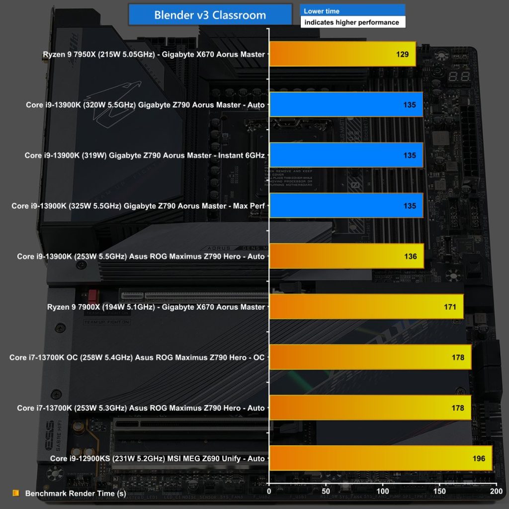 In Blender the mighty Ryzen 9 7950X tops the charts however the Core i9-13900K on the Gigabyte Z790 Aorus Master follows closely behind.