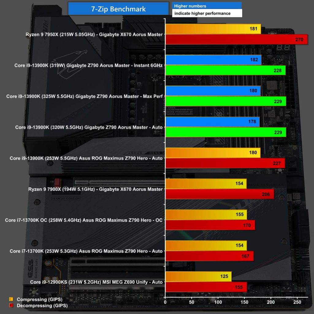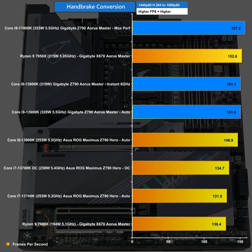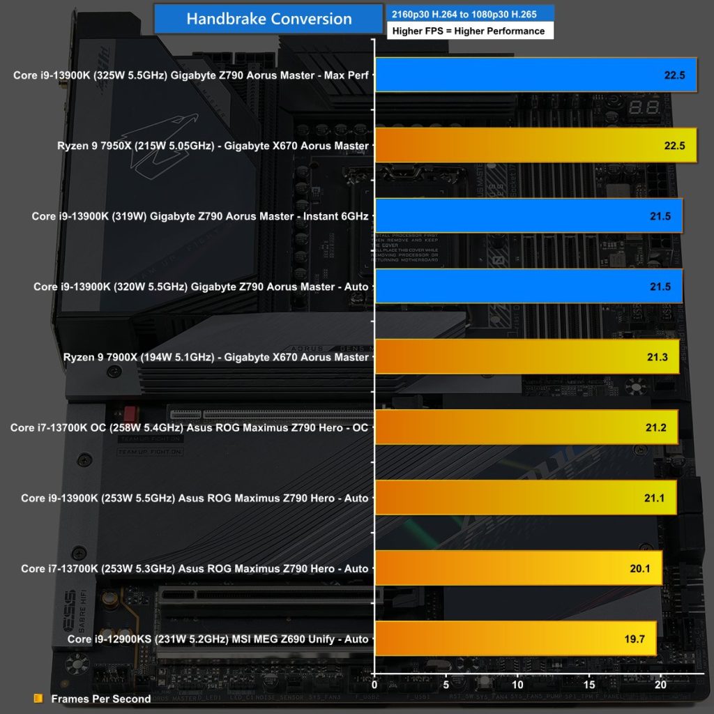 In Handbrake Conversion H.265 we have put the Gigabyte at the top of the chart however the reality is a dead heat with the Ryzen 9 7950X. Even so, this is impressive.