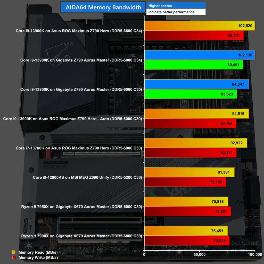 Once again the Gigabyte Z790 Aorus Master scores well and beats the Asus ROG Maximus Z790 Hero by a few frames per second.