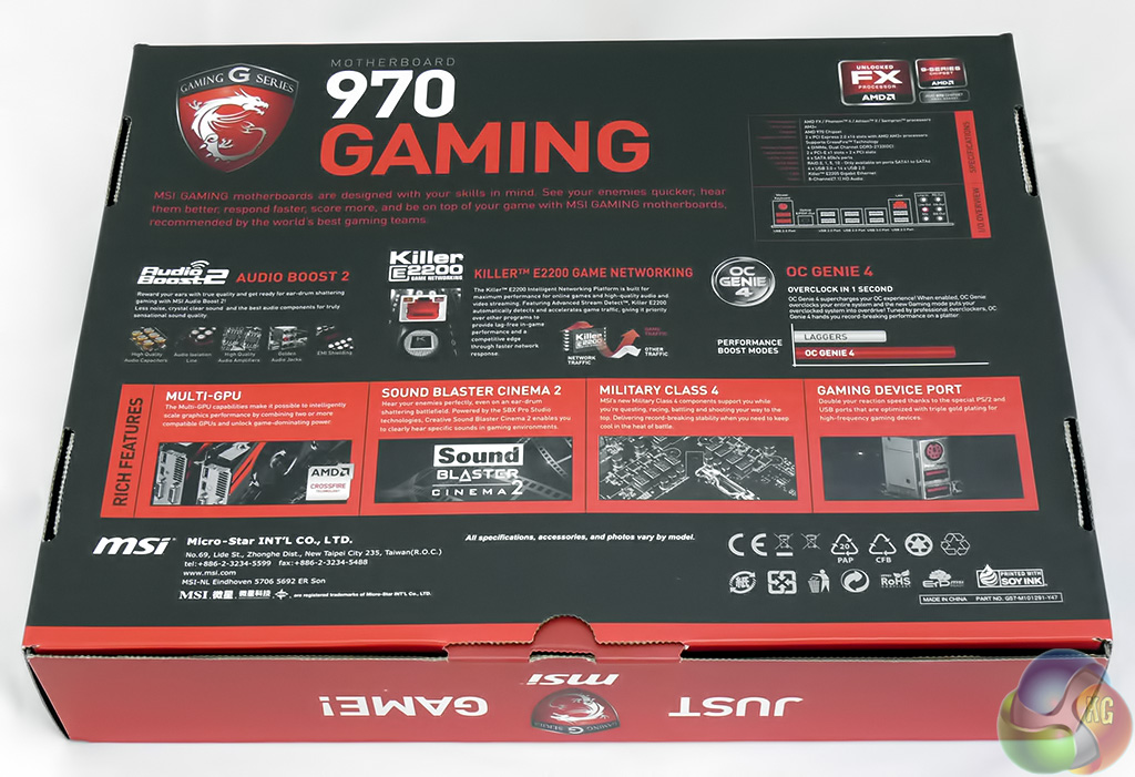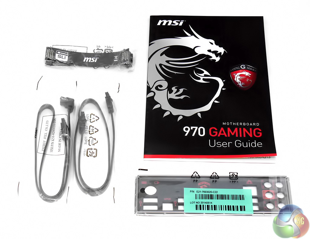 On the back of the red and black box you'll find a list of the main features of this model. Inside you get a printed manual, the I/O shield, two SATA cables and an SLI bridge cable. The pack of black and white labels are stickers that you use to identify the various cables inside your new PC.