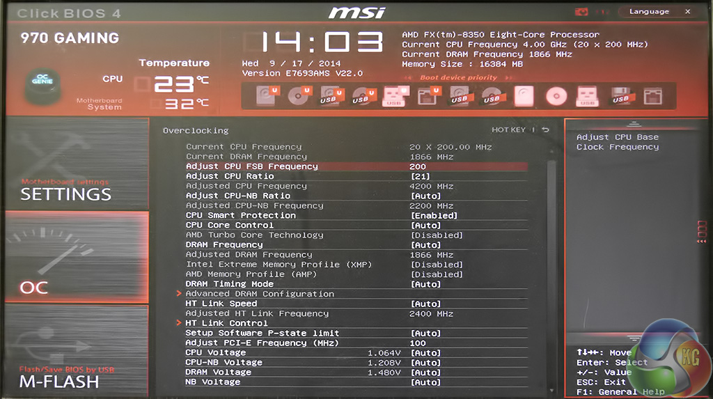 Manually overclocking the FX-8350 requires a small amount of work in the MSI Click BIOS. Increasing the Northbridge voltage from 1.1V to 1.2V was easy, however raising the CPU by +0.3V caused the PC to freeze during POST. MSI has included a flick switch that forces the 970 Gaming to enter Slow Mode and allows you to recover to the BIOS without clearing the CMOS.