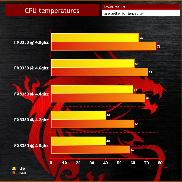 As the power and clock speeds increase so too does the temperature of the CPU package and core. To take the extreme cases, at stock speed the package temp is 40 degrees and the core temp is 58 degrees. By any standards those are reasonable figures, especially when you consider they were observed with the cooling fans running in the range of 25-50 percent.