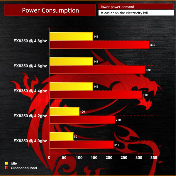 Clearly, you might think, those overclocking figures demonstrate that MSI was horribly cautious when it set OC Genie 4 to overclock by such a pathetic handful of MHz. Well you might think that but there is method to MSI's apparent madness. The problem is that FX-8350 is a power-hungry CPU. At idle the test PC drew 80W at the wall socket which rose to 215W in the Cinebench CPU test. This is a rise of 135W, which is pretty much want you expect when a 125W TDP processor is working hard.