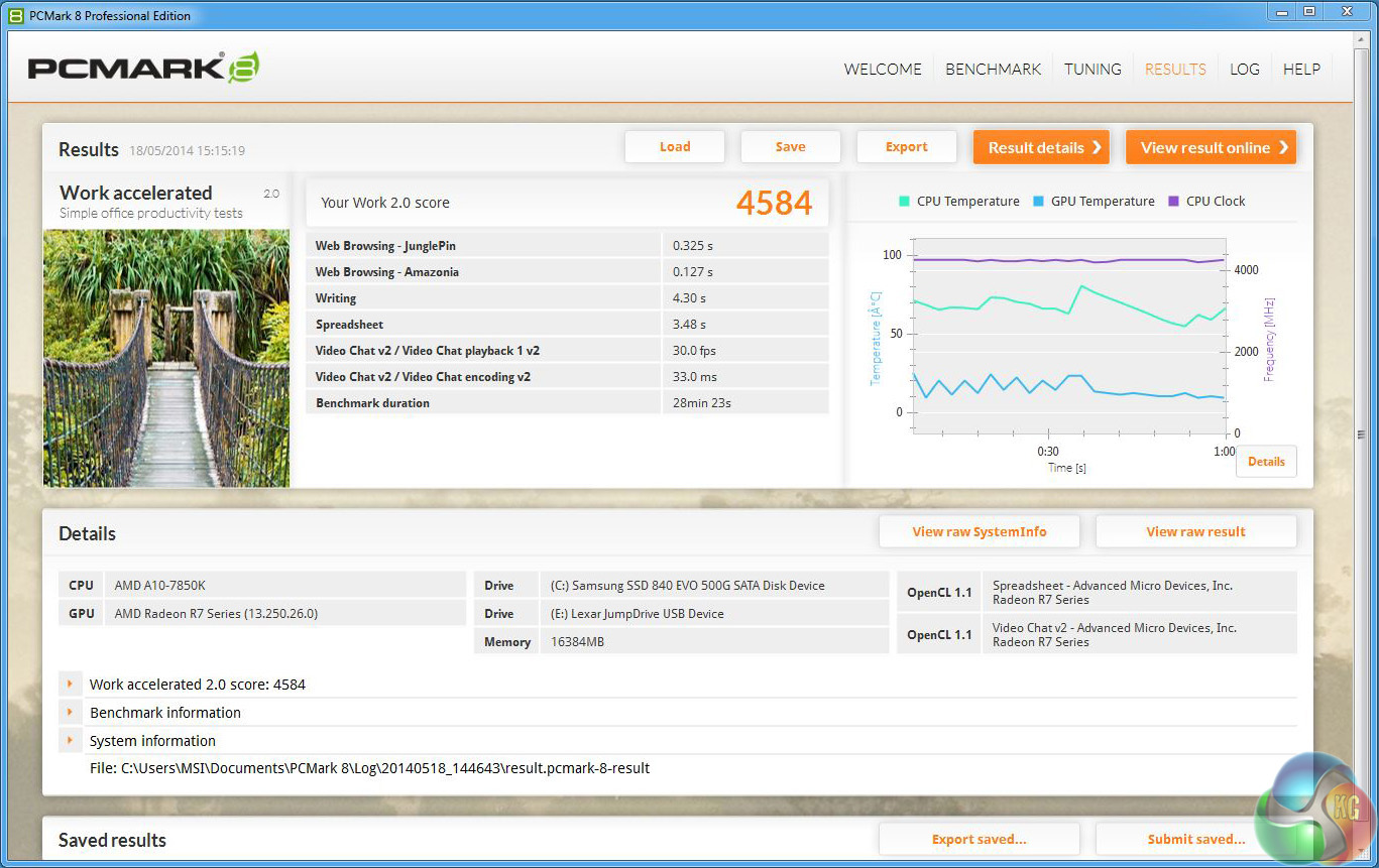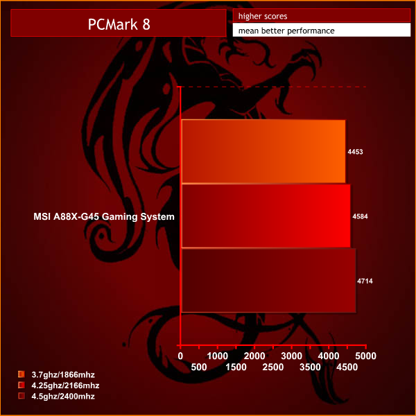 At stock speeds the system performed well. A PC Mark 8 score of 4,453 comfortably beats the Gigabyte P35K Core i7 laptop that I recently reviewed. Overclocking increased the score to 4,584 and then 4,714 marks which isn't a massive increase – but is worth having.