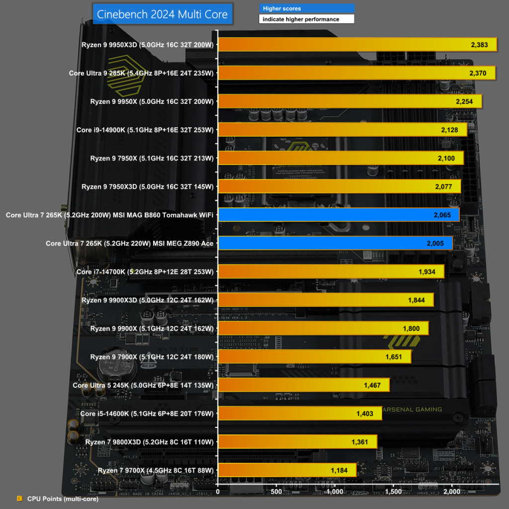 In Cinebench 2024 Multi Core the MSI MAG B860 Tomahawk WiFi performs well and is level pegging with the much more expensive MSI MEG Z890 Ace.