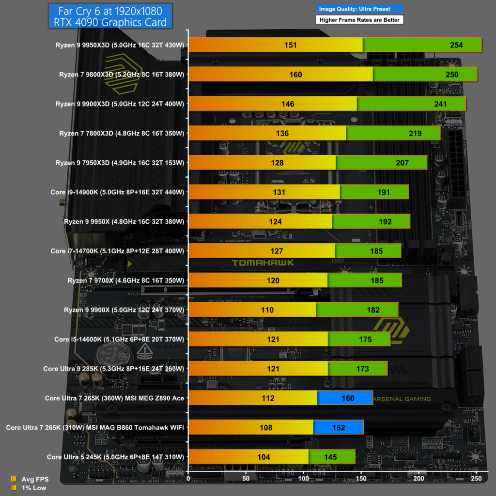In Far Cry 6 at 1080p the MSI MAG B860 Tomahawk WiFi performs well at 1080p but takes a small hit compared to our previous testing.