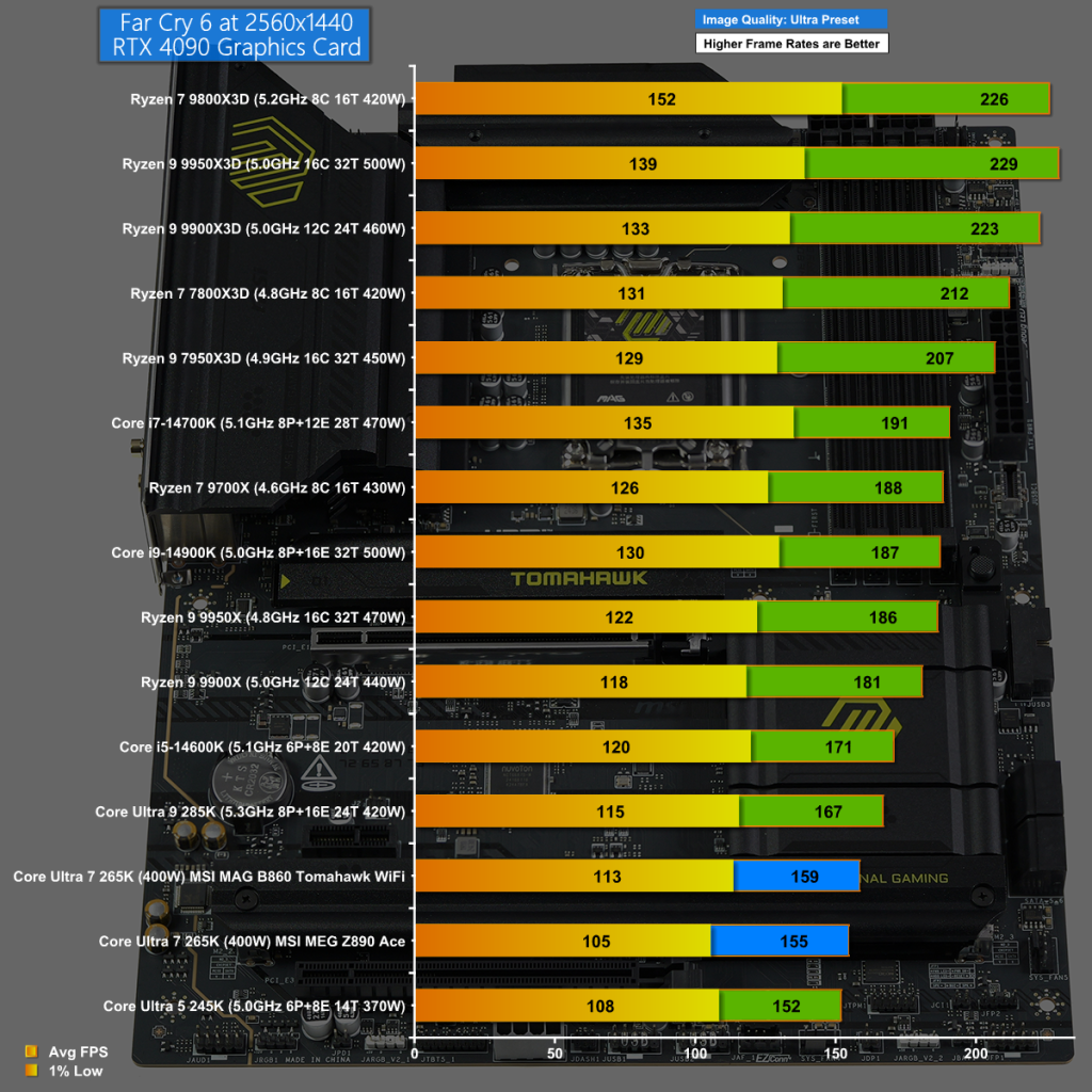 Stepping up to 1440p in Far Cry 6 helps the MSI MAG B860 Tomahawk WiFi. This might be due to a shift in load from the CPU to the GPU with high resolution but whatever the reason, the B860 performs well.