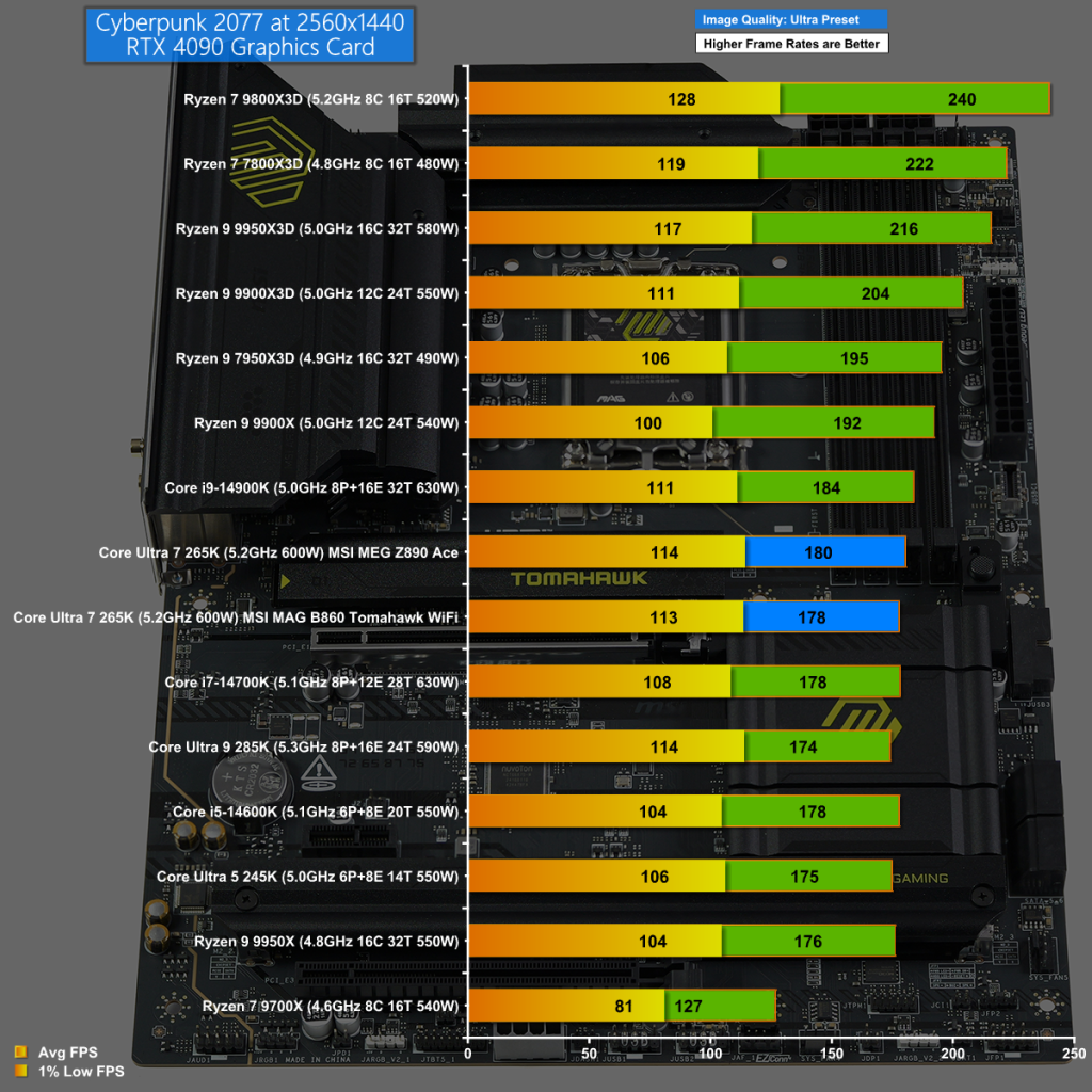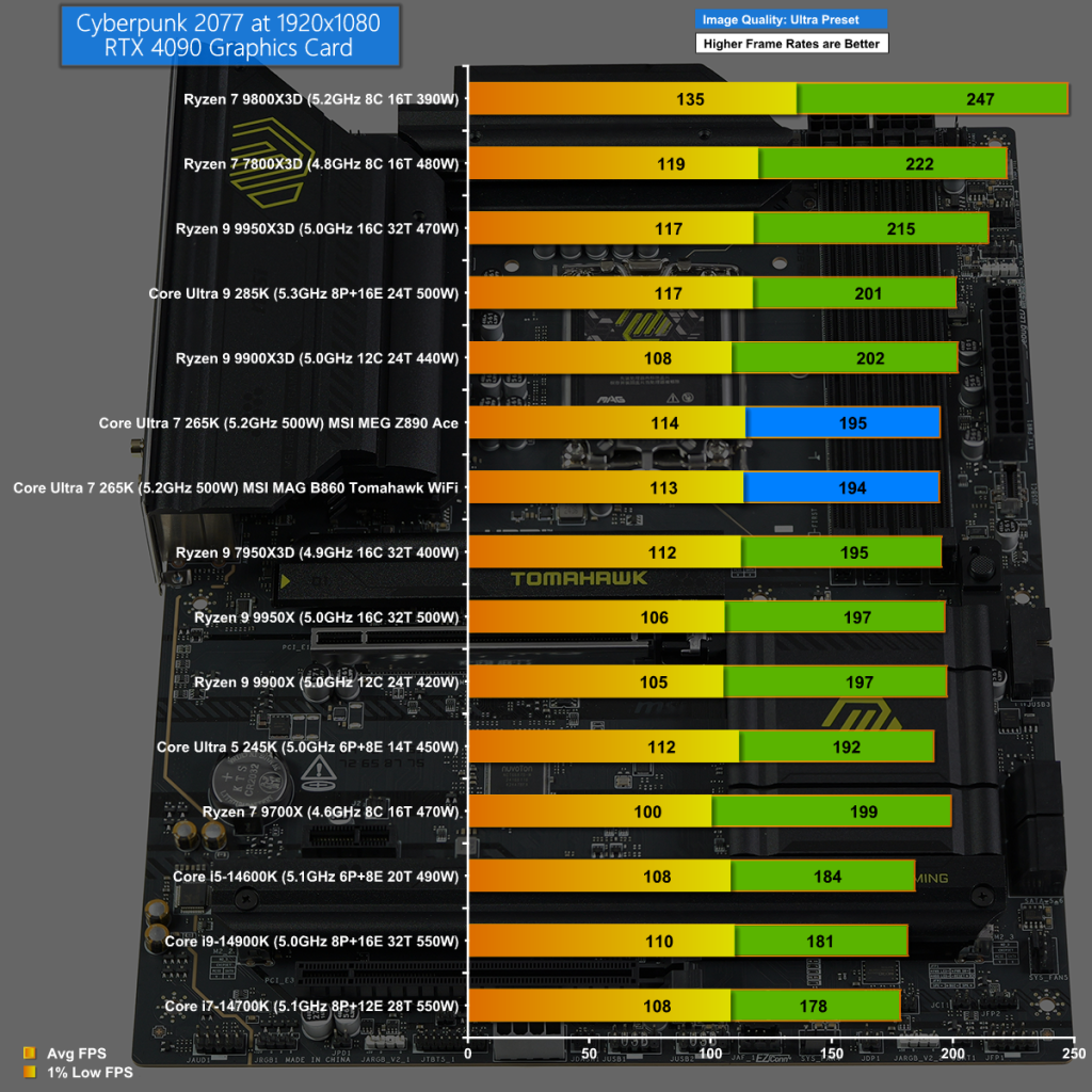 In Cyberpunk 2077 at 1080p the B860 Tomahawk does a good job and cannot be separated from the Z890 Ace,