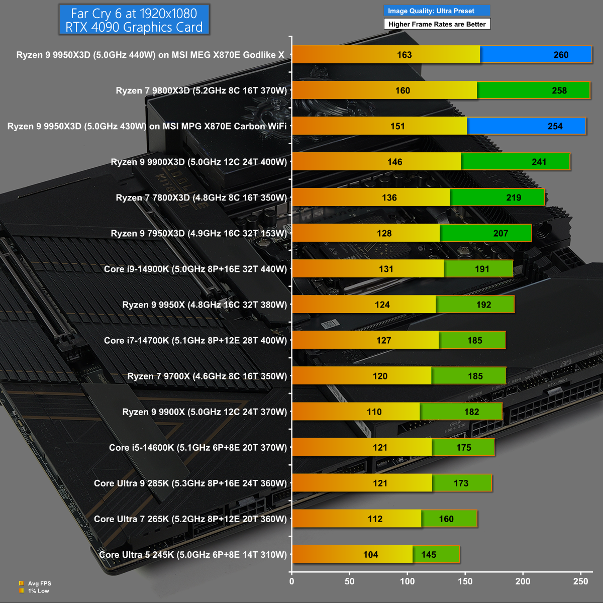 We also see very good performance in Far Cry 6 at 1080p. It is a close-run thing at the top of the chart but the Godlike X wins the day.
