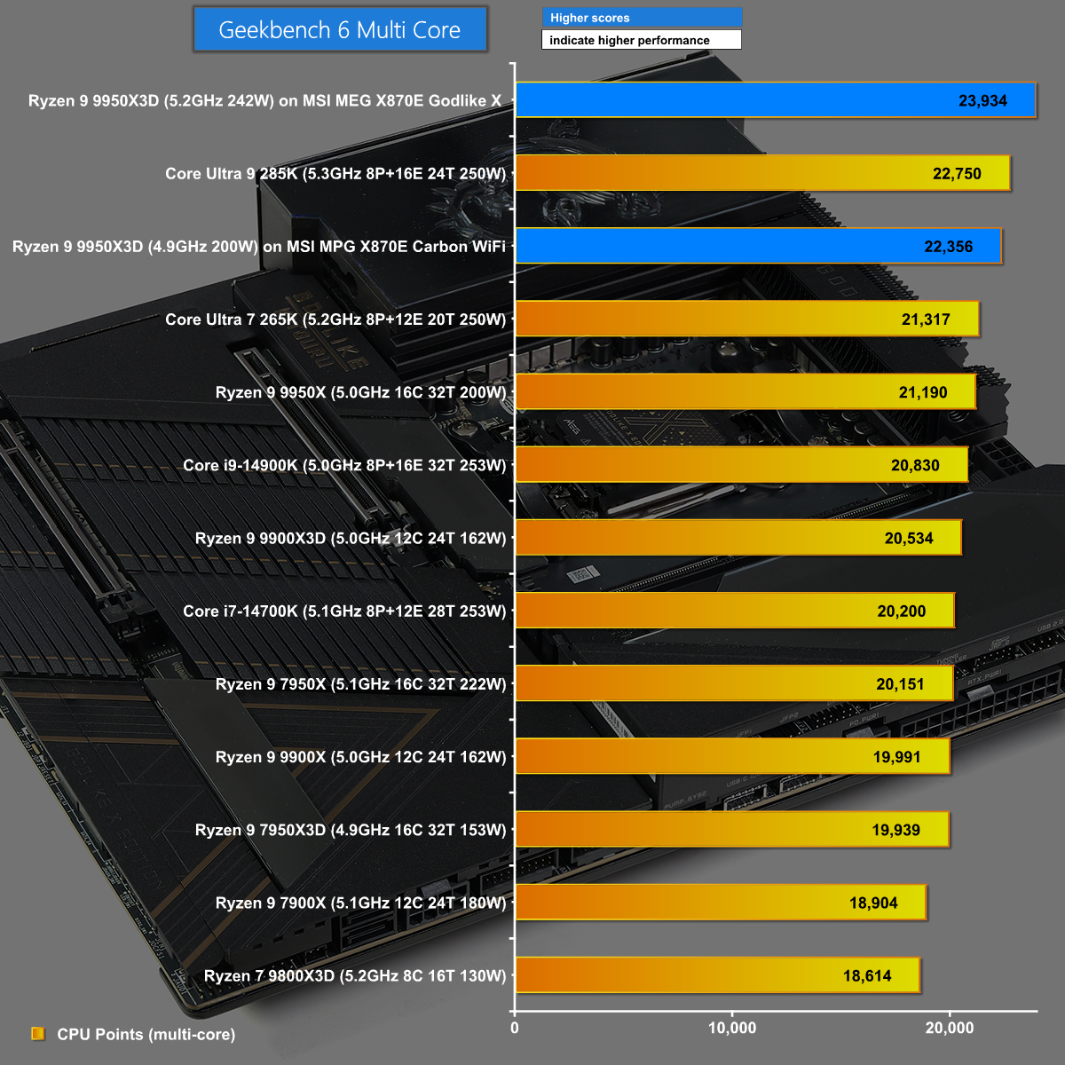 In Geekbench 6 Multi Core we see the Godlike X at the top of the chart. As we show in our video this is likely thanks to the BIOS setting which delivers more power to the CPU and runs it at a higher clock speed than we have previously seen. The results are impressive.