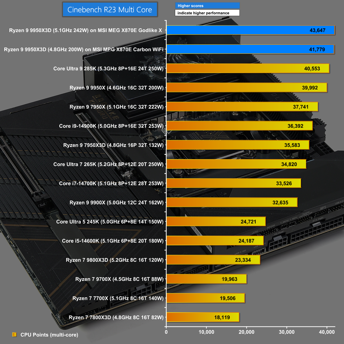 It is a similar story in Cinebench R23 Multi Core where the Godlike X delivers storming performance, albeit while using more power.