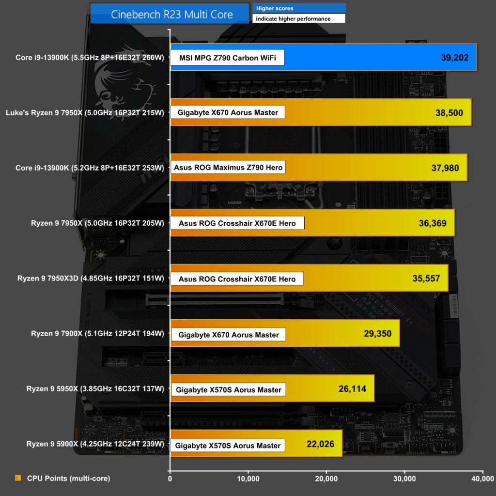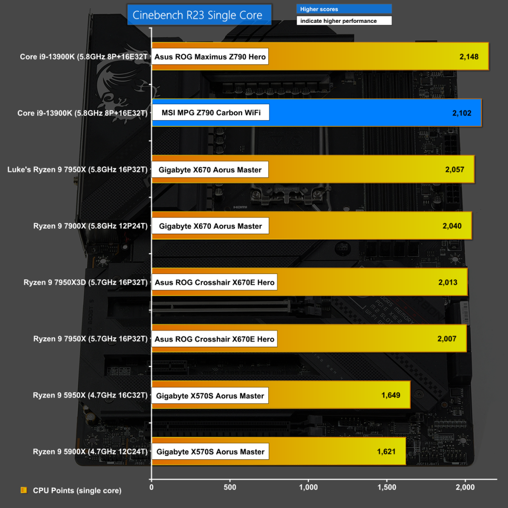 In Cinebench R23 Single Core the MSI also performed well and ran the Core i9-13900K at 5.8GHz but lost out to the Asus ROG Maximus Z790 Hero by a handful of points.