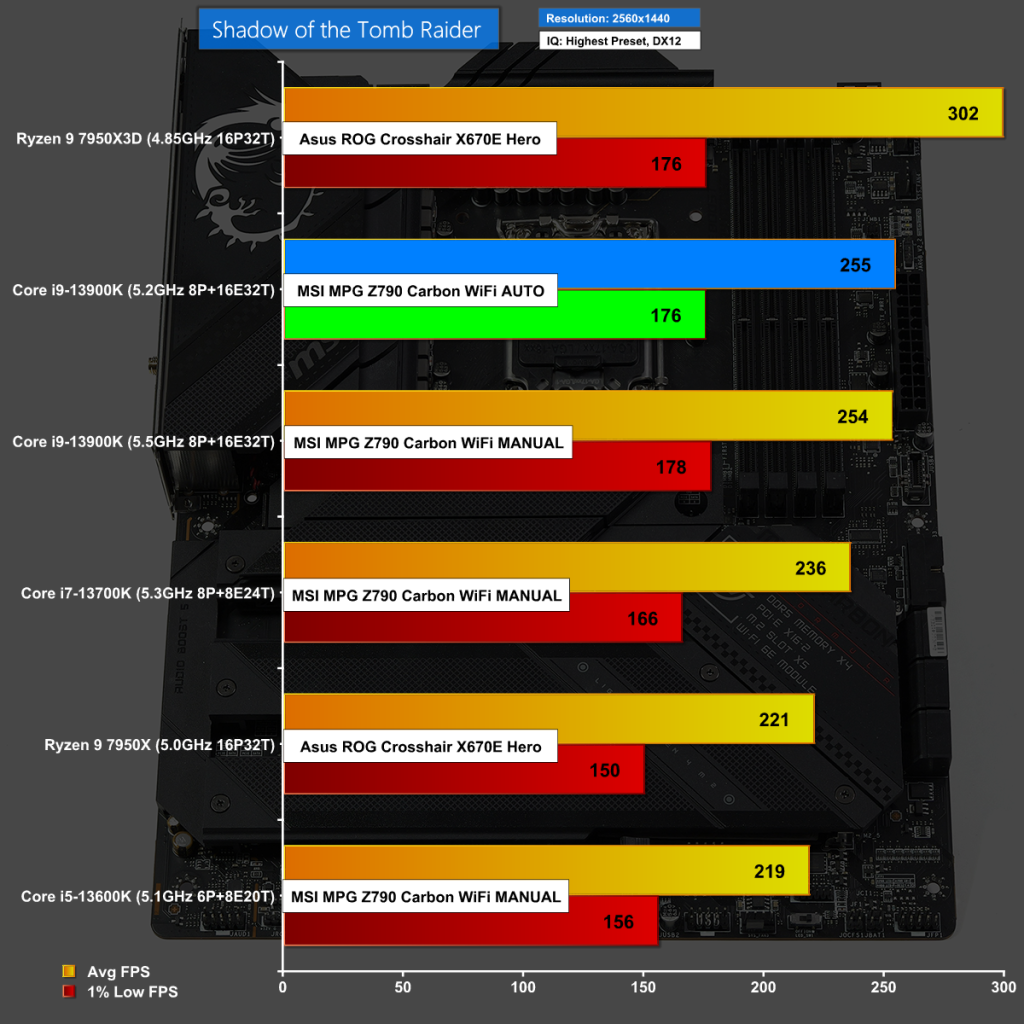 Shadow of the Tomb Raider at 1440p also shows the MSI MPG Z790 Carbon WiFi doing well on Auto settings, however this time it is an effective tie with our chosen manual settings.