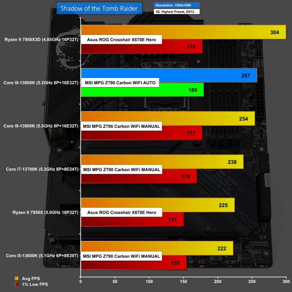 The MSI MPG Z790 Carbon WiFi drives Shadow of the Tomb Raider at 1080p along at a ferocious rate with excellent gaming performance.