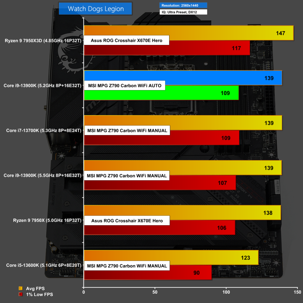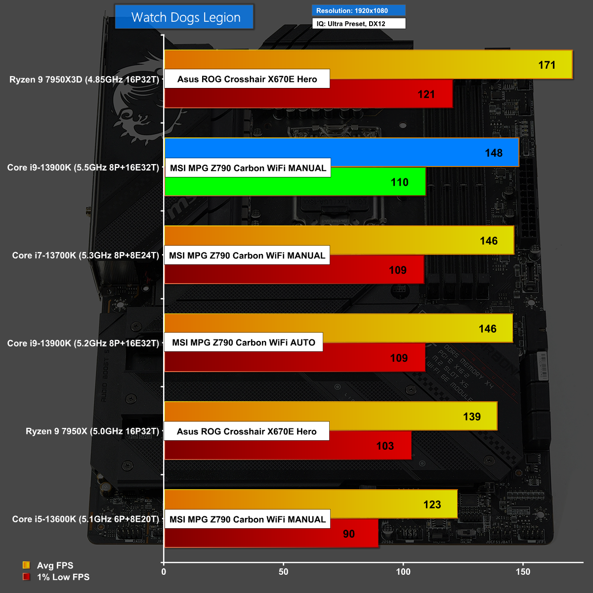 In Watch Dogs: Legion at 1080p there is a fair degree of spread between the difference set-ups and once again the MSI MPG Z790 Carbon WiFi does well.