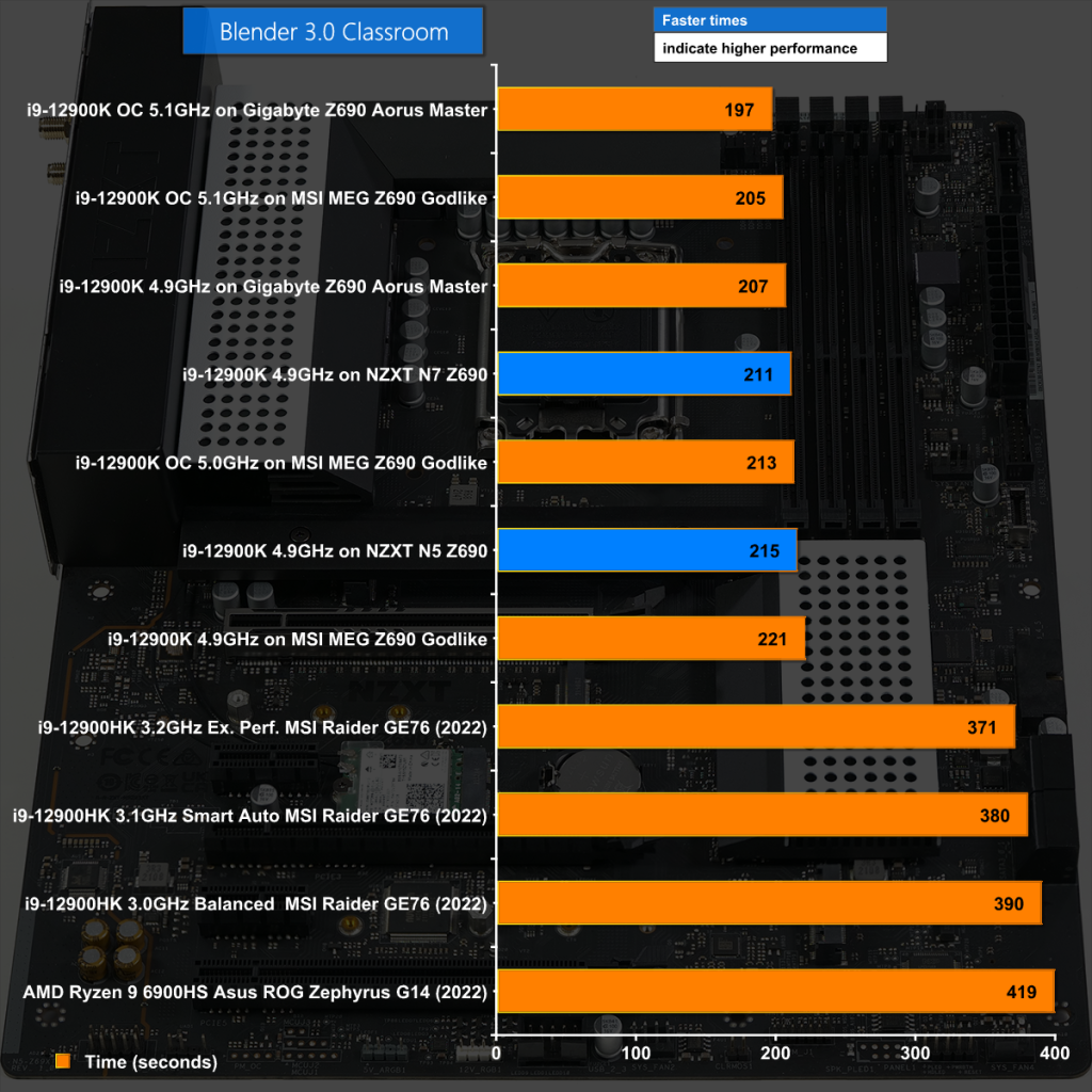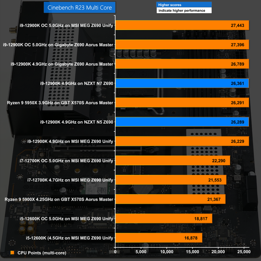 in Cinebench R23 Multi Core, the NZXT N5 Z690 performed reasonably well however it did not extract the maximum from our Core i9-12900K.