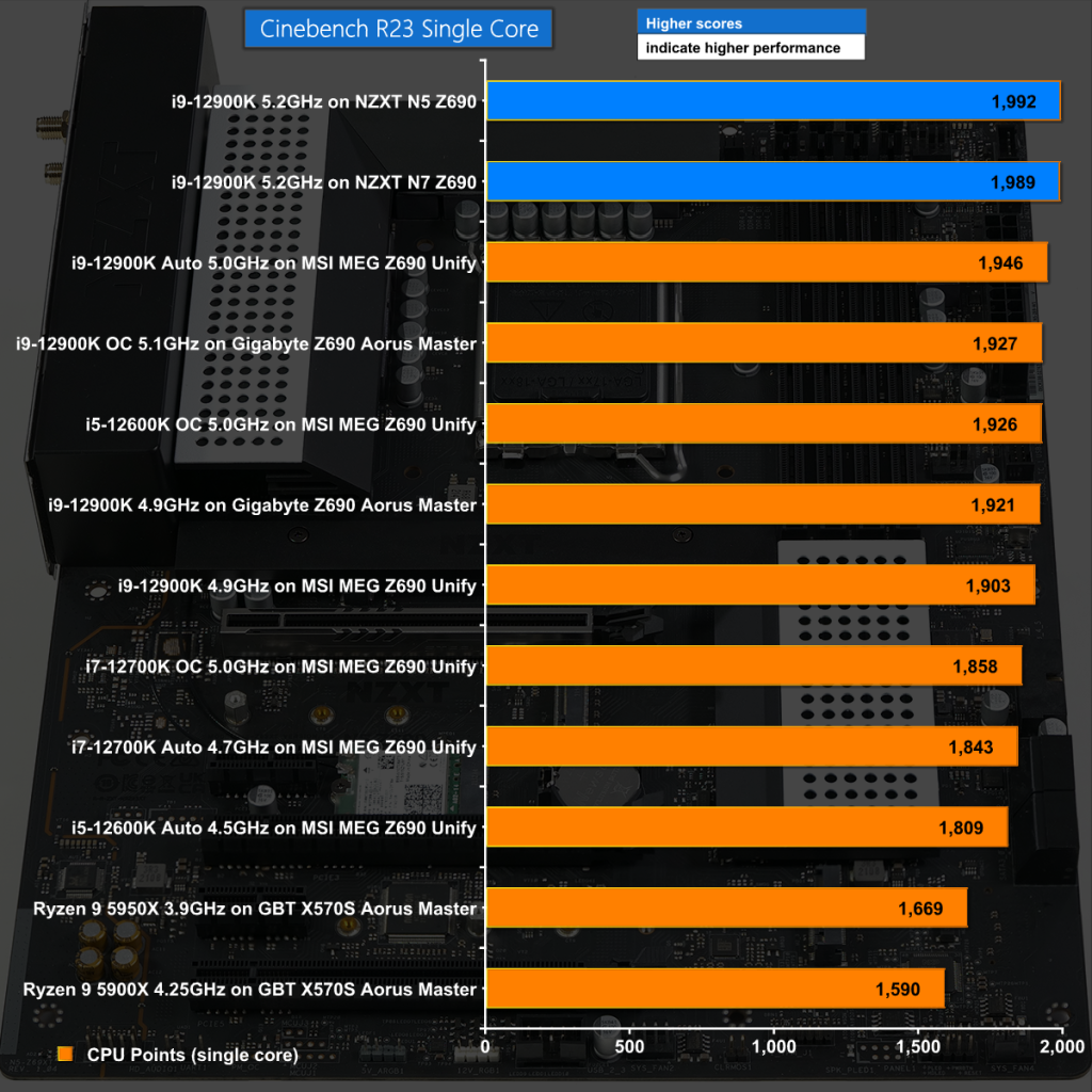 In Cinebench R23 Single Core, the two NZXT motherboards run our CPU at 5.2GHz and take top honours.