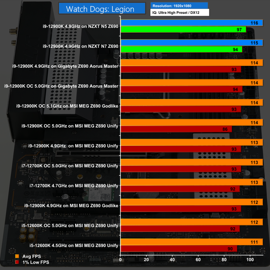 In Watch Dogs: Legion we again see the NZXT N5 Z690 hit the top of the chart.