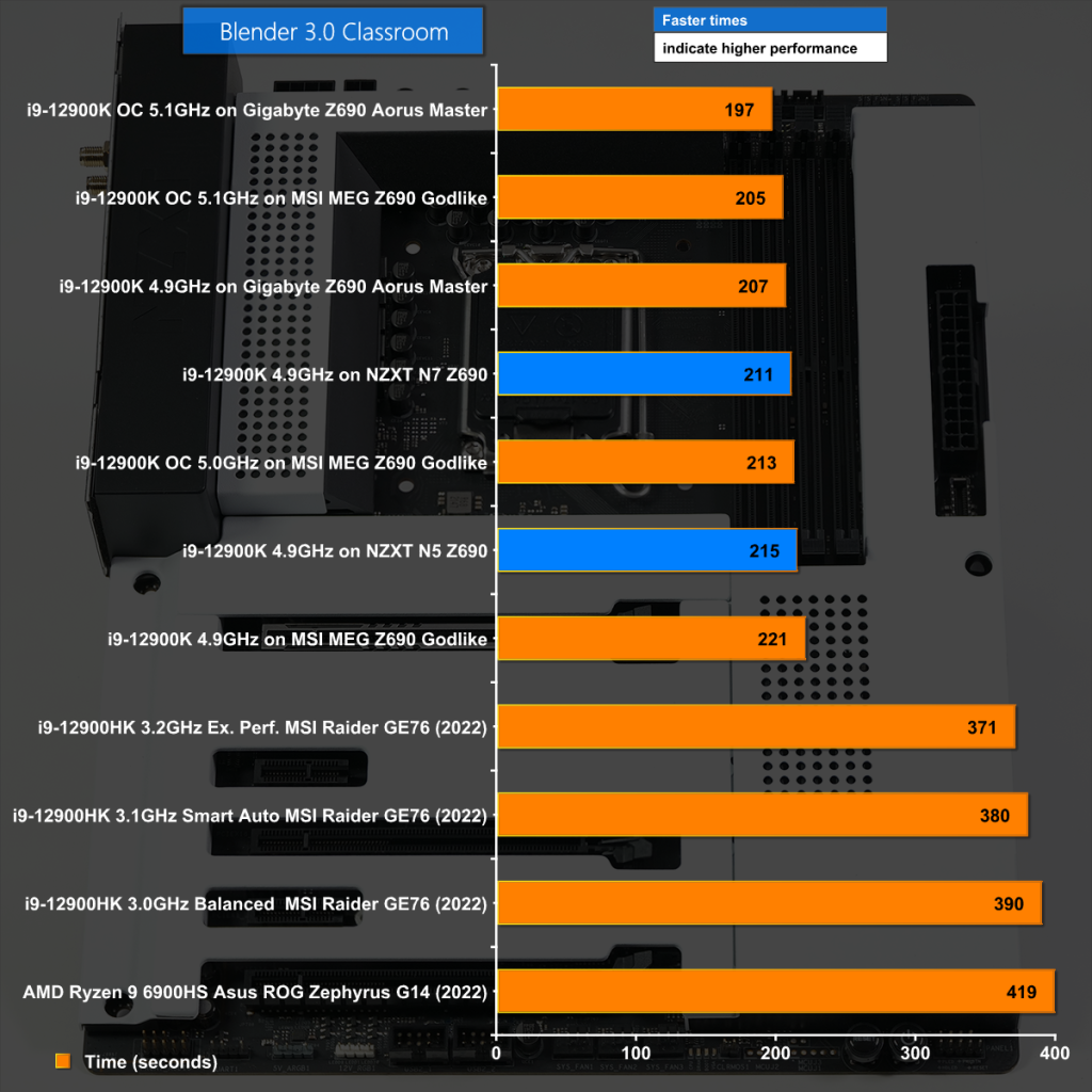 In Blender we see the NZXT N7 trailing slightly behind the Gigabyte Aorus Master on Auto settings.