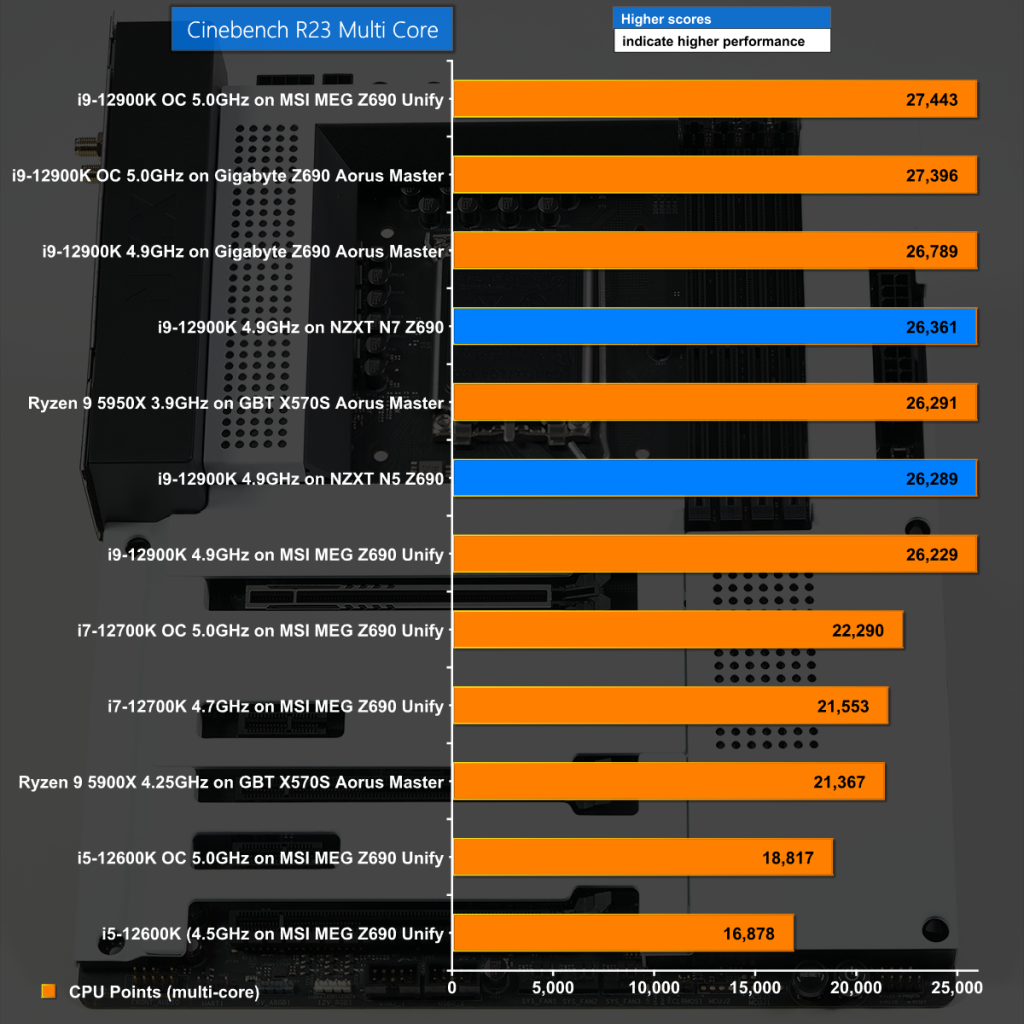 in Cinebench R23 Multi Core ,the NZXT N7 Z690 did not use our Core i9-12900K to best effect and the performance is unimpressive.