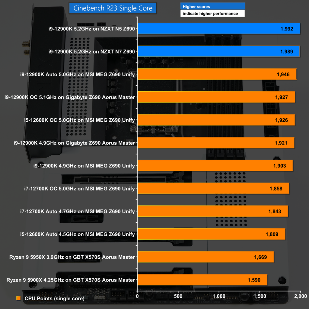 In Cinebench R23 Single Core, the NZXT motherboards run our CPU at 5.2GHz and as a result they sit at the top of the chart.