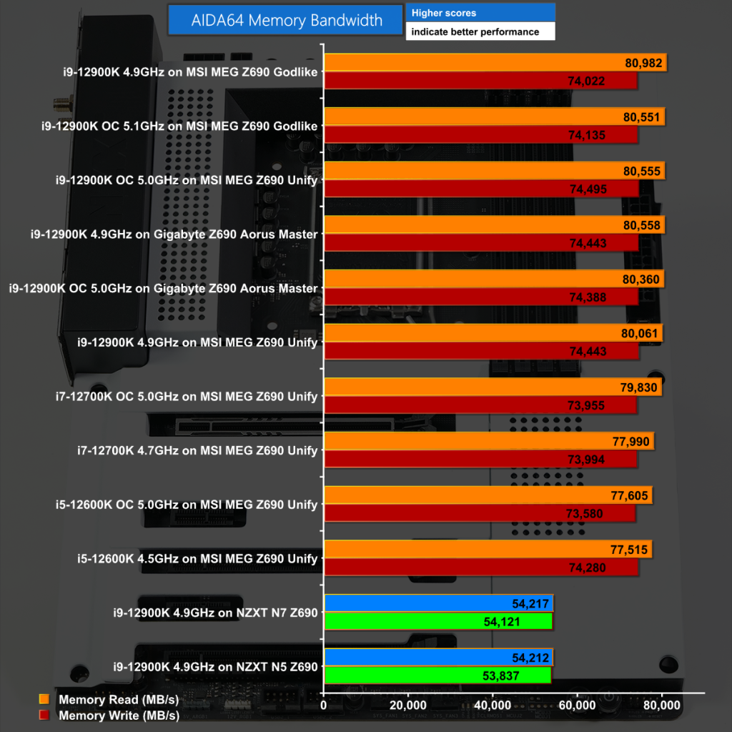 The NZXT N5 Z690 and N7 Z690 motherboards run on DDR4 memory and as a result they sink to the bottom of this chart where they are competing against motherboards that are running much faster DDR5 memory.