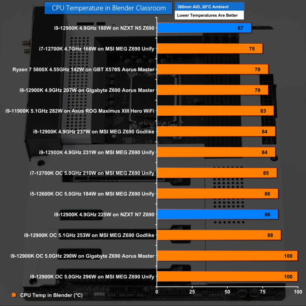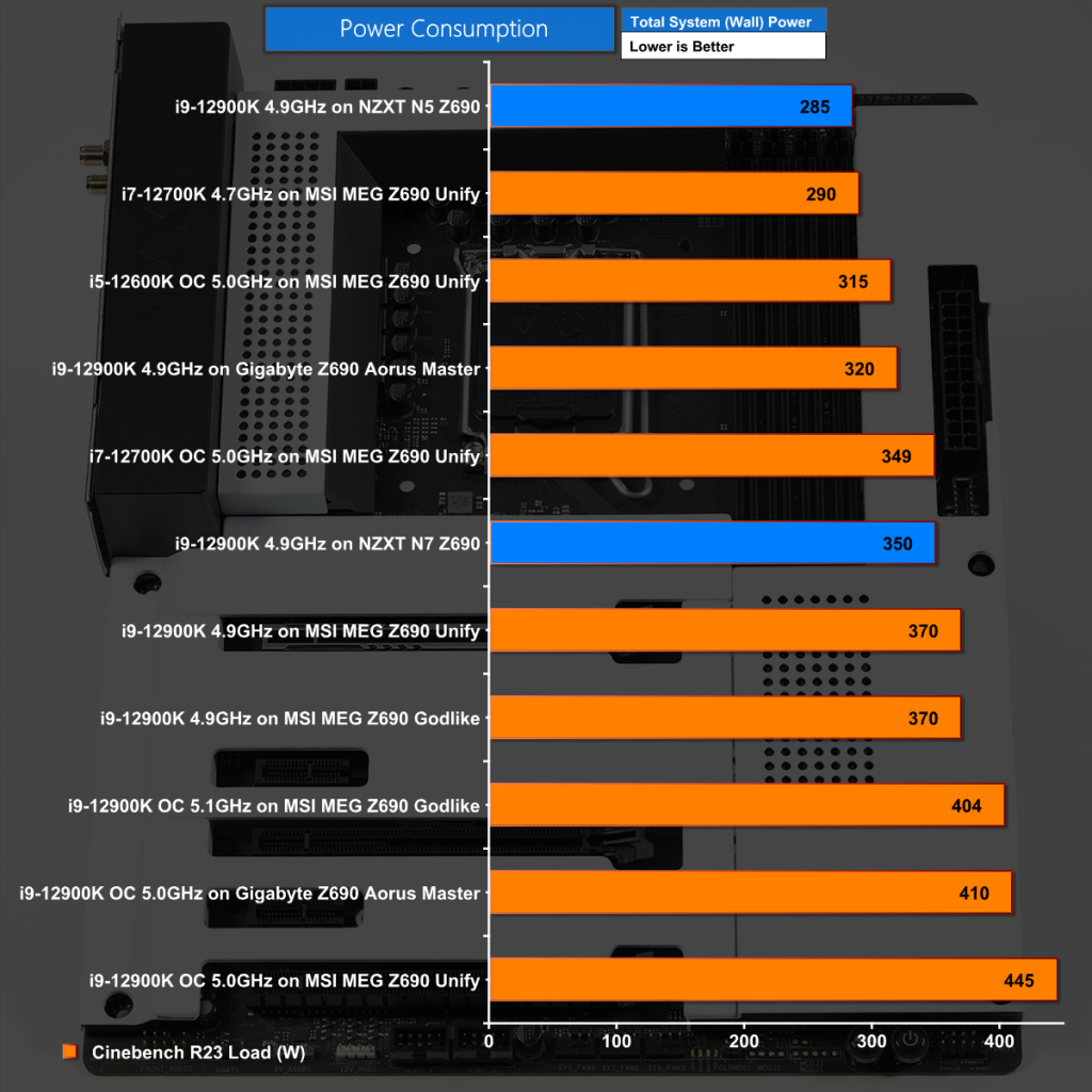 The NZXT N7 Z690 draws 225W for the Core i9-12900K on Auto settings and as a result the power draw is in the mid-range of other systems we have tested.
