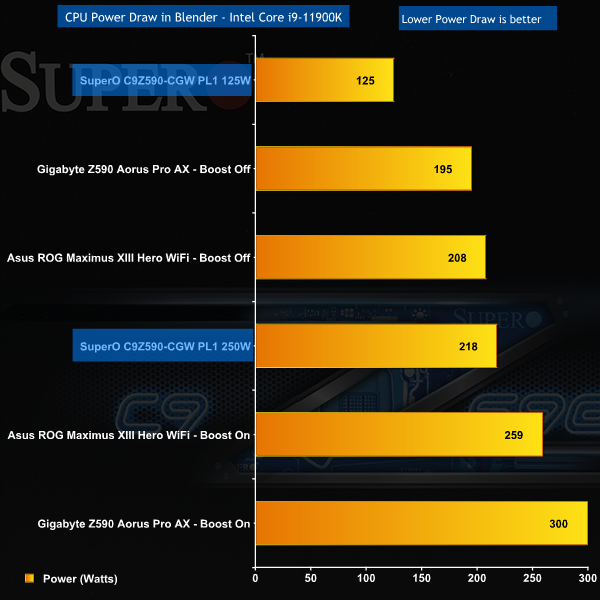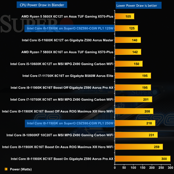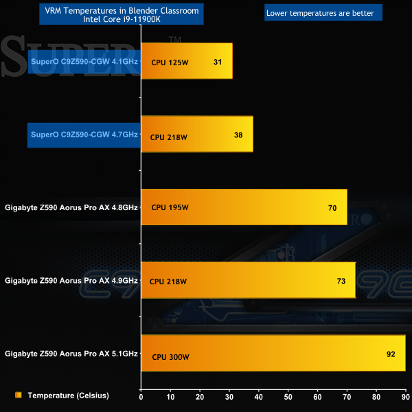 While we like to see low VRM temperatures, the figures reported by HWiNFO64 on the SuperO C9Z590-CGW seem just a bit too good to be true. The 31 degrees Celsius figure for the system running at 125W may well be correct as each power stage can only be losing a tiny amount of power through inefficiency. It's the other figure that looks problematic as the SuperO seems to be running the VRMs at 37 degrees while the CPU is pulling 218W, while the Gigabyte Z590 Aorus Pro AX has a VRM temperature of 73 degrees at the same 218W load.