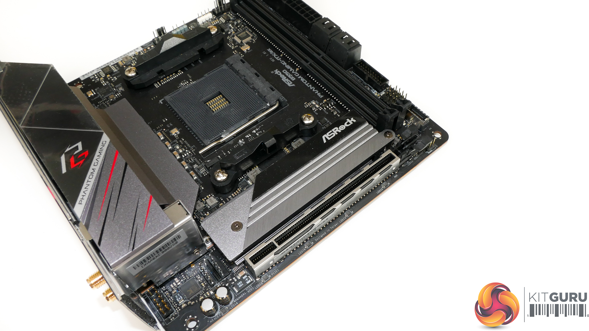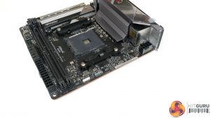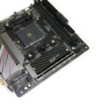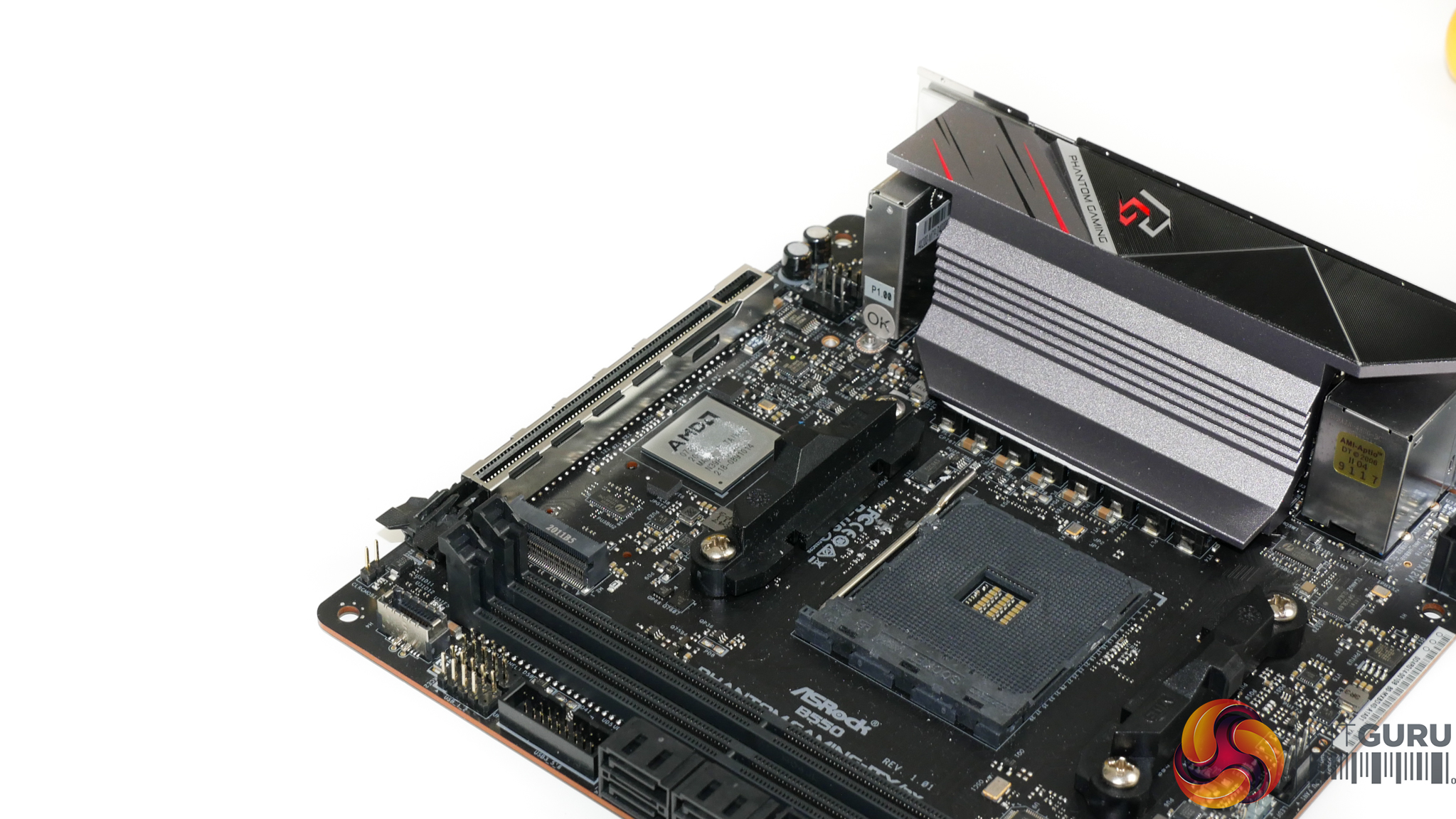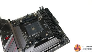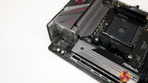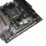 The standard AM4 CPU socket with standard AM4 mounting brackets is used for the B550 Phantom Gaming-ITX/AX. This is a notable change from the arguably more inconvenient LGA 115X mounting holes that ASRock decided to use with the X570 Phantom Gaming-ITX/TB3.