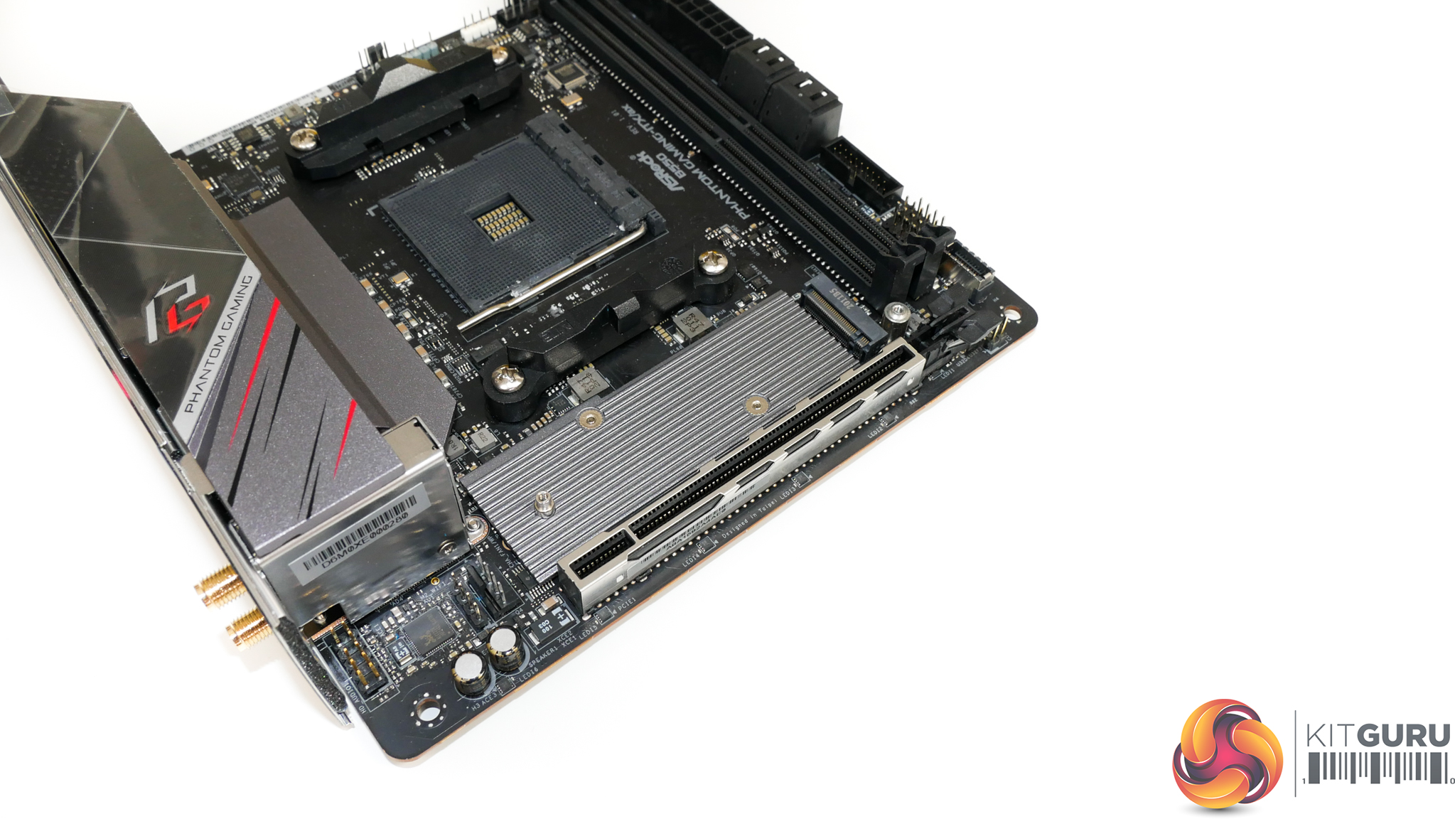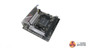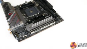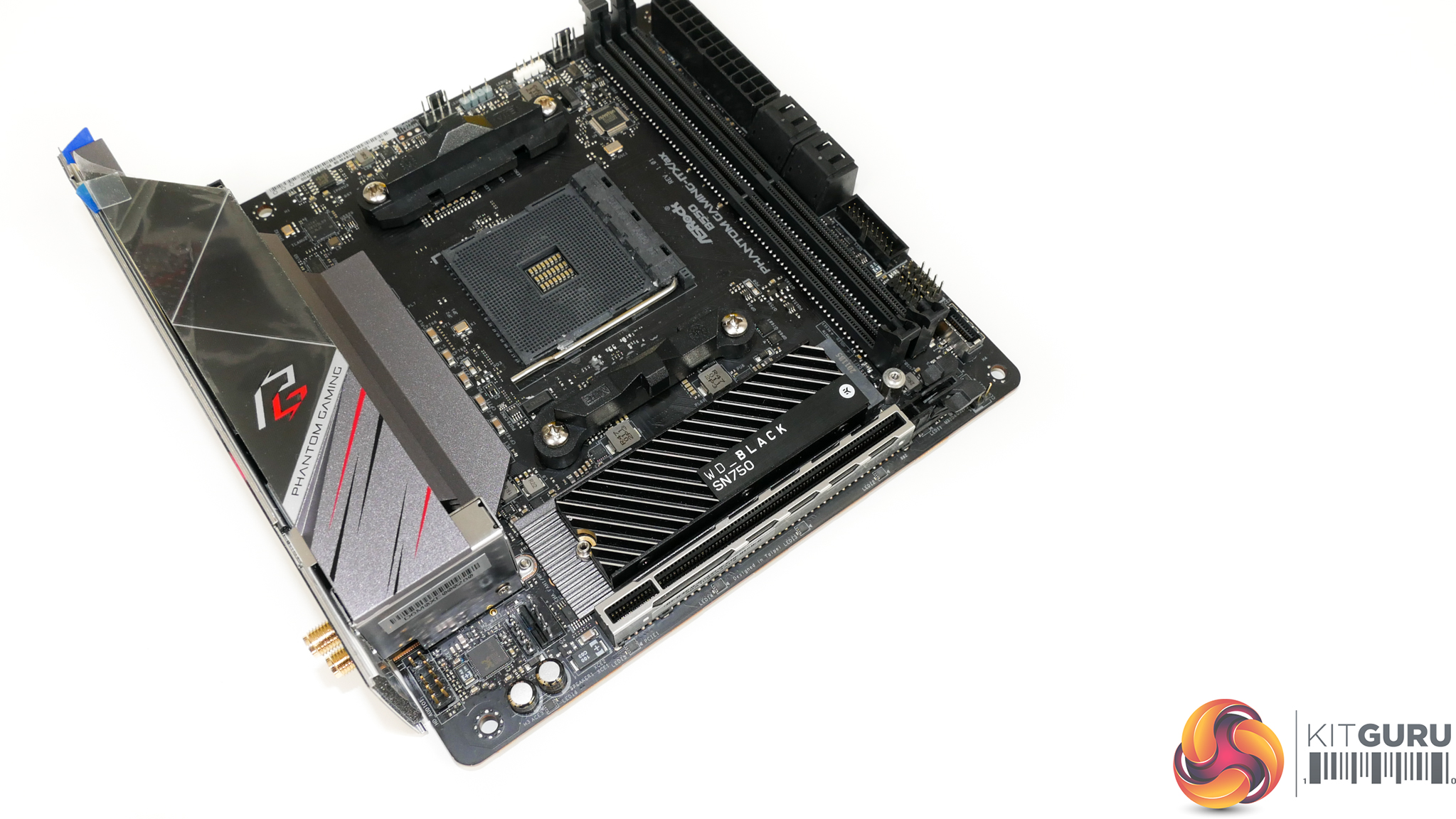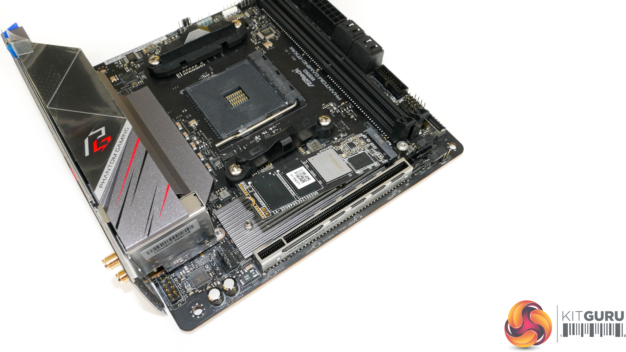 The standard AM4 CPU socket with standard AM4 mounting brackets is used for the B550 Phantom Gaming-ITX/AX. This is a notable change from the arguably more inconvenient LGA 115X mounting holes that ASRock decided to use with the X570 Phantom Gaming-ITX/TB3.