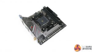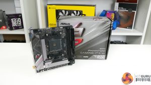 The ASRock B550 Phantom Gaming-ITX/AX motherboard uses the usual design for ASRock’s Phantom Gaming styling; you get lots of black and grey with touches of red.
