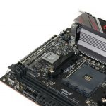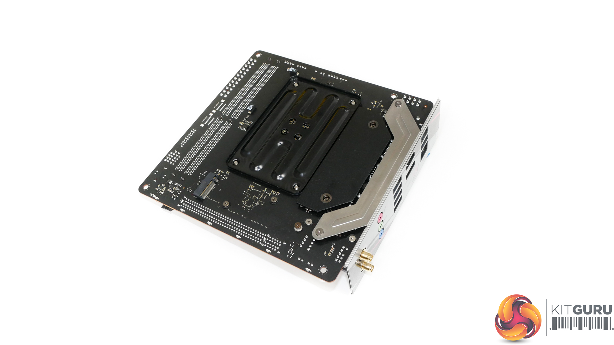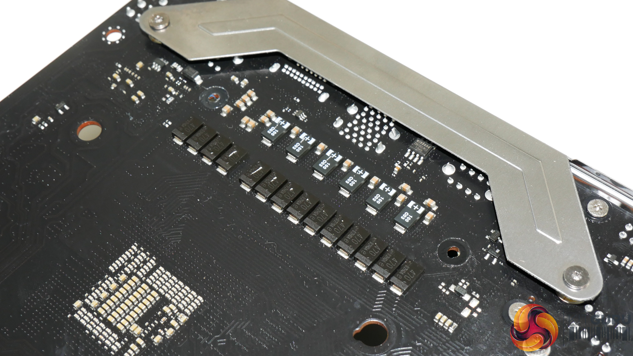ASRock positions a solid cooling plate on the rear side of the MOSFET area. This is used to sap heat away from the PCB and perhaps the flat capacitors. An 8-layer PCB is used for the motherboard.