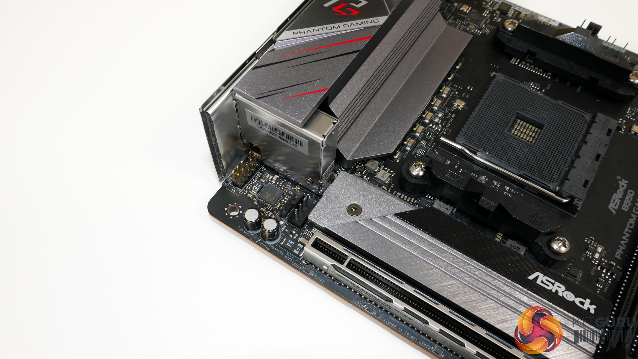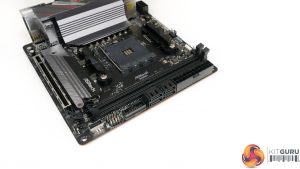 Beneath the M.2 area is another heatsink that is mounted directly to the motherboard PCB. This is used to cool the B550 chipset beneath. As B550 does not kick out much heat, I have no concerns about the chipset heatsink’s close proximity to a potentially hot M.2 device.