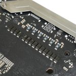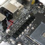 Eight total alloy chokes are mounted on the front side and work in coordination with the banks of flat capacitors mounted on the board's rear side. Six ‘100 C03‘ marked capacitors are allocated for the primary 6-phase CPU VRM. There is also a 10+4 bank of ‘470 02HQA‘ marked capacitors. ASRock advertises the motherboard as utilising 12k-rated Nichicon capacitors.