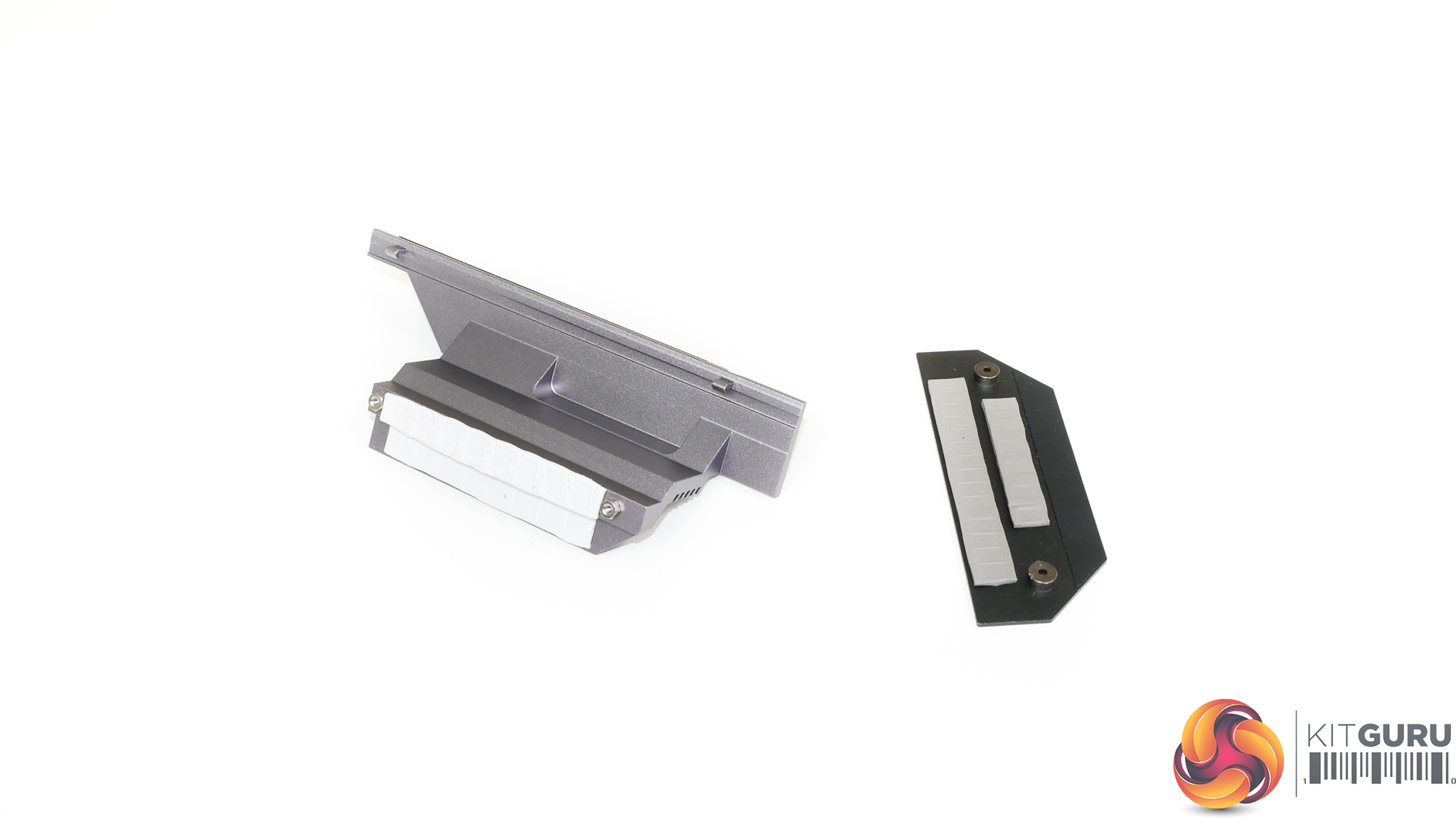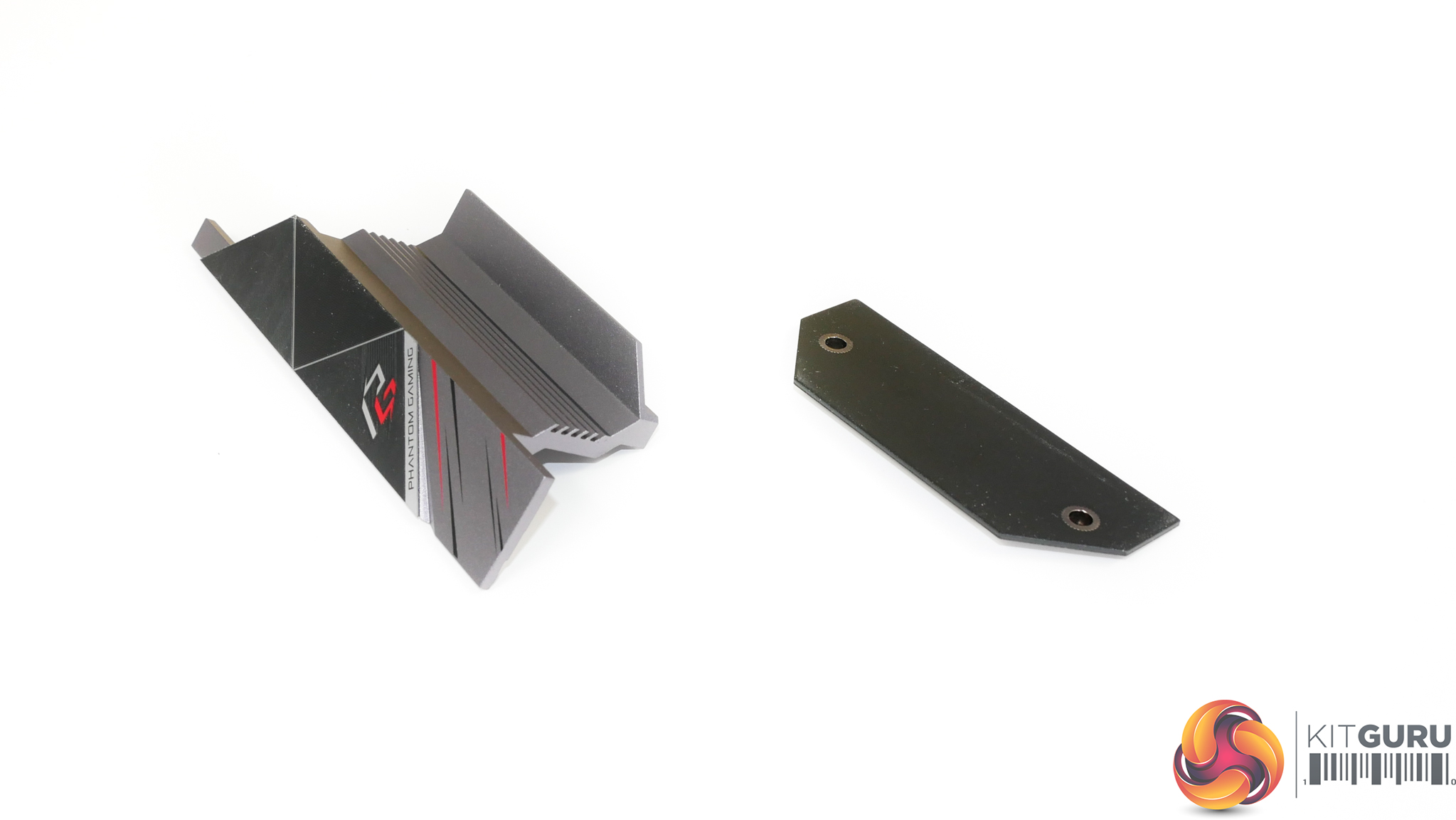 The rear side heatsink for the capacitors adds cooling capacity by distributing the VRM location heat over this plate’s area. It is more of a heatspreader than a heatsink, given its low profile and minimal surface area design. Two thermal pads make proper contact with all of the capacitors, so ASRock has clearly made an effort to allow this heatspreader to remove excess thermal energy from the vicinity.