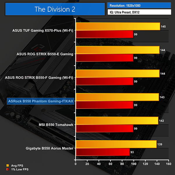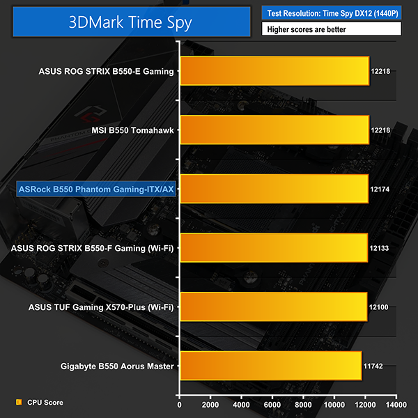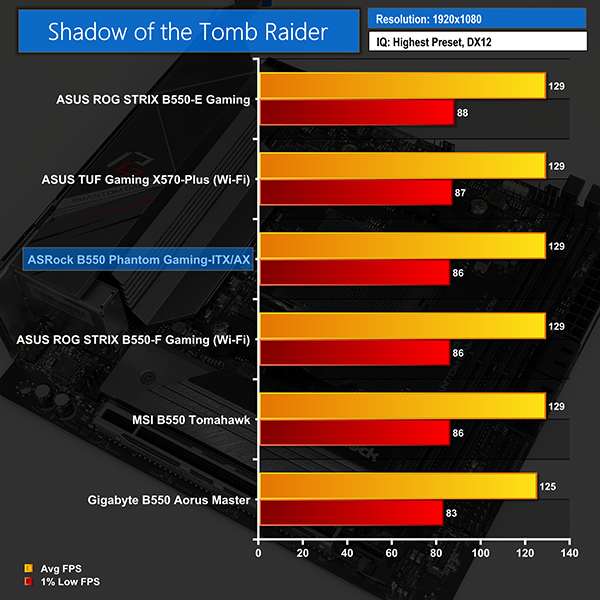 Gaming performance from ASRock’s Mini-ITX offering is good and the results are comparable to Gigabyte and MSI B550 boards. ASUS boards typically retain a small but consistent lead in both gaming tests.